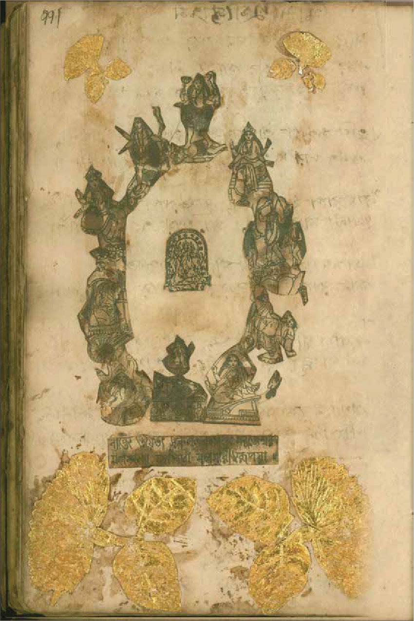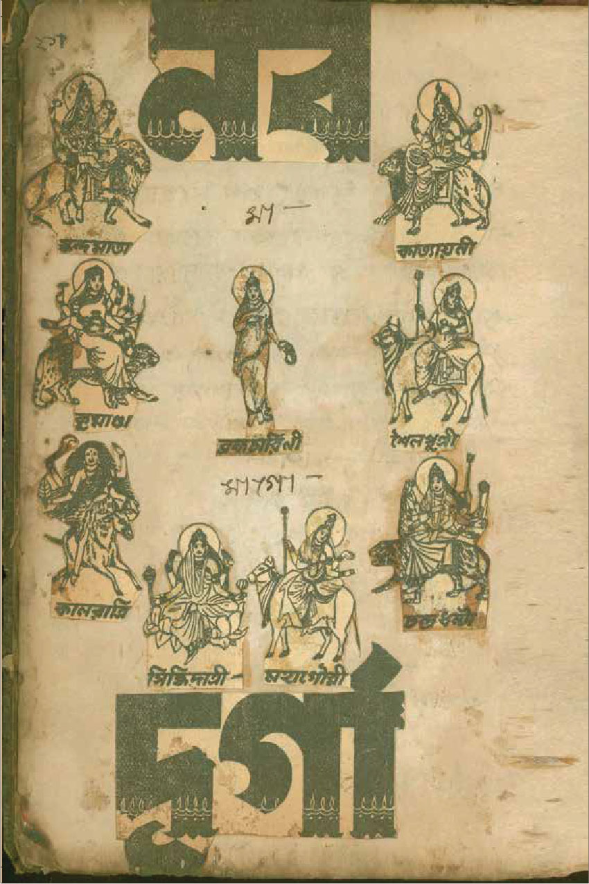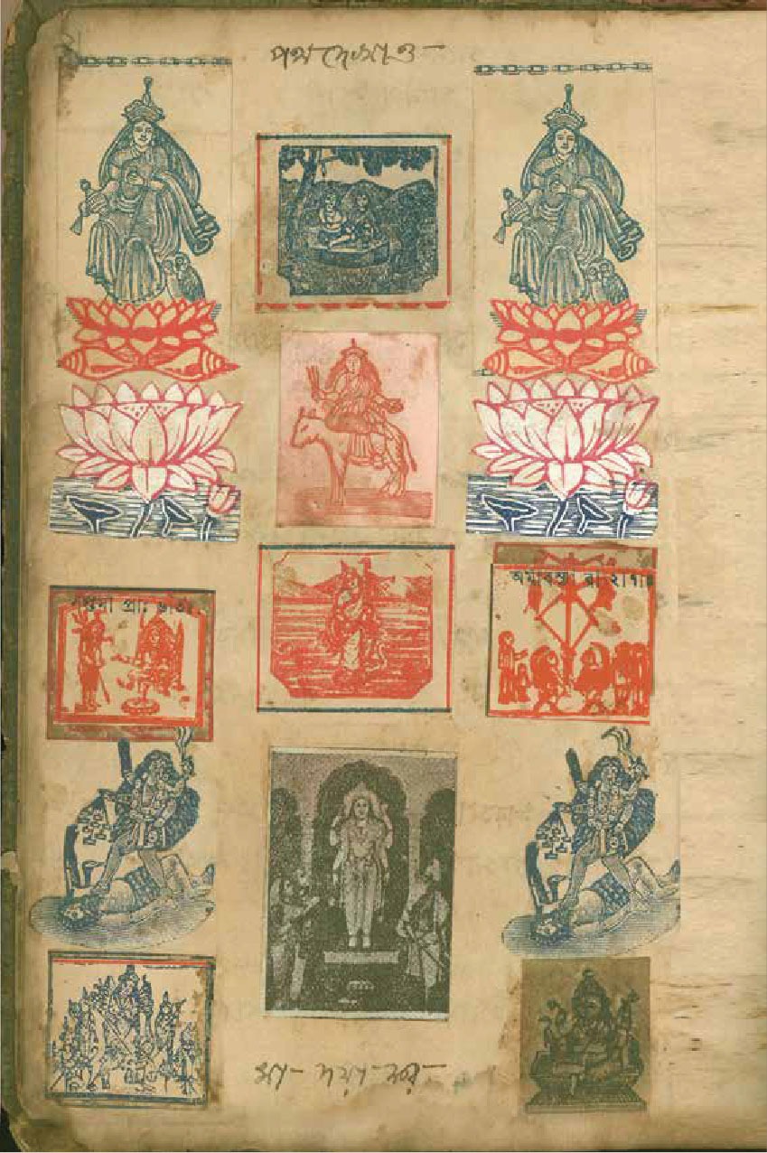 শেষ ক’পাতা বাদ দিয়ে, ১০২ পৃষ্ঠা অবধি প্রতি পাতায় পৃষ্ঠাসংখ্যা লিখেছেন ইন্দুবালা। স্ক্র্যাপবুক শুরু পাতাজোড়া পায়ের কাট-আউট দিয়ে। তার ওপর সাঁটা গ্রেকো-রোমান উৎসের এক ফুলদানির স্ট্যাম্প-সাইজ় কাঠখোদাই– পদযুগলে ইন্দুবালার পুষ্পার্ঘ্য। বাঁ পাশের পাতায়– ‘ওঁ অপবিত্র পবিত্রোবাং সর্ব্বাবস্তাংগত পিবা [সর্বাবস্থান গতহ্বপিবা]।/যৎস্মরে [যৎ সরেত] পুন্ডরিকাক্ষং স্ব ভার্য্য ভান্তরে [স বাহ্য অভ্যান্তরে] শুচি।।’– দেহ শুচির মন্ত্র। ছোট ছোট কিছু ভুল বানান। যা দিয়ে ইন্দুবালার, প্রান্তের ও সেসময়ের উচ্চারণগত ভুলত্রুটি ধরা পড়ে। এরপর একে একে দেখা যায় রাধাকৃষ্ণের ছবি; প্রাতঃকৃত্য স্তব; চাঁদার বিল থেকে কেটে বসানো দেবী শীতলার ছবি, তার নিচে শীতলার মন্ত্র; পরের পাতায় আসনশুদ্ধি; স্বরস্বতীর ছবি কেটে, সেঁটে, তার নীচে বীণাপাণি মন্ত্র– ‘লাগ লাগ স্বরস্বতী মোর কন্ঠে লাগ…’। আরও একটু এগিয়ে ৯ নম্বর পাতায় দুটো গণেশের ছবির কাট-আউট– একটা রঙিন লিথোগ্রাফ। কোনও বই থেকে নেওয়া। অন্যটা লাল রঙের কাঠখোদাই। কোনও কোম্পানির ট্রেড-মার্ক। অন্যত্র শিব-পার্বতী, বিষ্ণু, বুদ্ধ, কালী, দুর্গার ছবি; খবরের কাগজ থেকে কাটা কৃষ্ণ-সম্বন্ধীয় তথ্য; অন্য কোনও বই থেকে টেক্সট কেটে ছবির নিচে জুড়ে ন্যারেশন নির্মাণ। এসবের পাশাপাশি এক এক করে আবিষ্কৃত হতে থাকে কালির কলমে হাতে লেখা মন্ত্র– আদ্যা স্তোত্রম, শিব প্রণাম, শ্রী শ্রী সরস্বতী লীলামৃত থেকে ‘কালীদাসের কাহিনী’র আস্ত দু’-পাতা কেটে নিয়ে জুড়ে দেওয়া হয়েছে খাতায়। ‘কালীদাসের কাহিনী’ কেন ইন্দুবালাকে আকৃষ্ট করেছিল, তা খানিক অনুমান করা যায়। ‘কালীদাস বলে বাণী/ খুঁজি আমি বীণাপাণি/ বিদ্যালাভ বাসনা আমার’– এই পঙক্তি বোধহয় হাতে লেখা বীণাপাণি মন্ত্র– ‘লাগ লাগ স্বরস্বতী মোর কন্ঠে লাগ…’-র সূত্র ধরে ইন্দুবালার বিদ্যালাভের বাসনার দিকটা আরও স্পষ্ট হয়।
