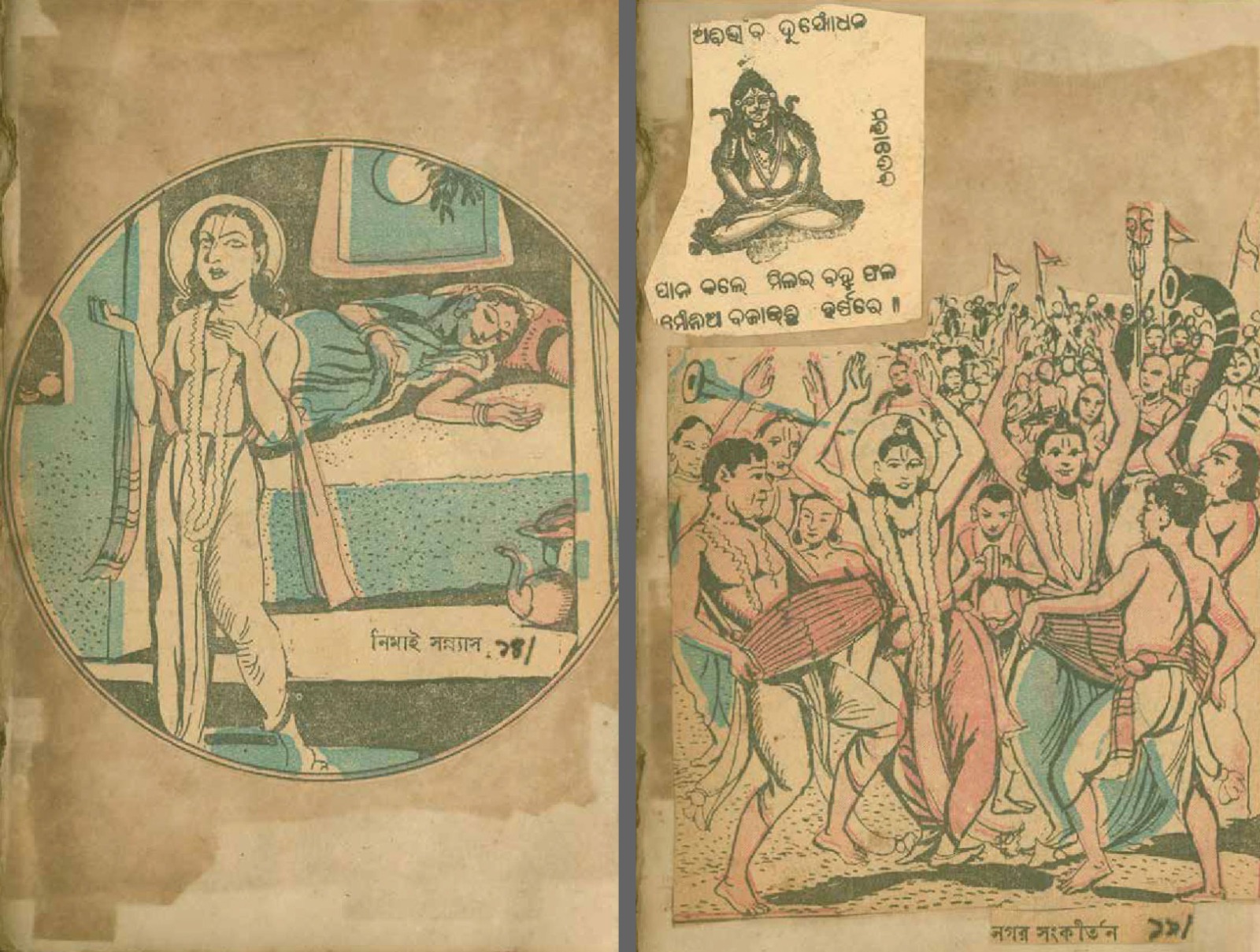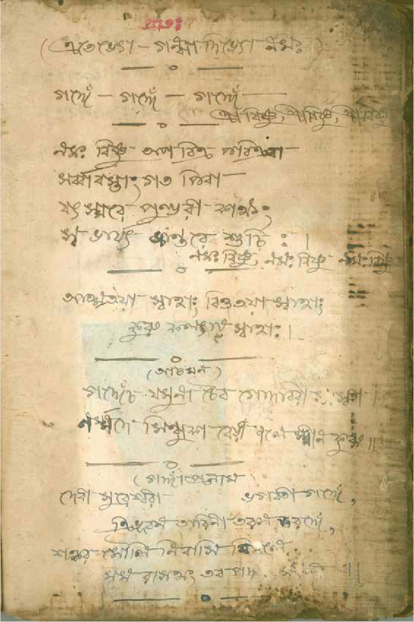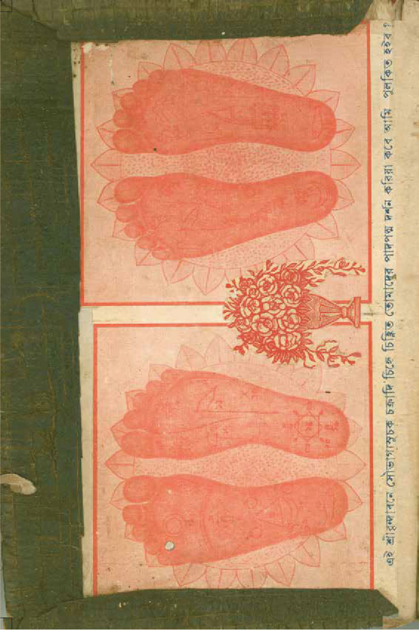 শেষ ক’পাতা বাদ দিয়ে, ১০২ পৃষ্ঠা অবধি প্রতি পাতায় পৃষ্ঠাসংখ্যা লিখেছেন ইন্দুবালা। স্ক্র্যাপবুক শুরু পাতাজোড়া পায়ের কাট-আউট দিয়ে। তার ওপর সাঁটা গ্রেকো-রোমান উৎসের এক ফুলদানির স্ট্যাম্প-সাইজ় কাঠখোদাই– পদযুগলে ইন্দুবালার পুষ্পার্ঘ্য। বাঁ পাশের পাতায়– ‘ওঁ অপবিত্র পবিত্রোবাং সর্ব্বাবস্তাংগত পিবা [সর্বাবস্থান গতহ্বপিবা]।/যৎস্মরে [যৎ সরেত] পুন্ডরিকাক্ষং স্ব ভার্য্য ভান্তরে [স বাহ্য অভ্যান্তরে] শুচি।।’– দেহ শুচির মন্ত্র। ছোট ছোট কিছু ভুল বানান। যা দিয়ে ইন্দুবালার, প্রান্তের ও সেসময়ের উচ্চারণগত ভুলত্রুটি ধরা পড়ে। এরপর একে একে দেখা যায় রাধাকৃষ্ণের ছবি; প্রাতঃকৃত্য স্তব; চাঁদার বিল থেকে কেটে বসানো দেবী শীতলার ছবি, তার নিচে শীতলার মন্ত্র; পরের পাতায় আসনশুদ্ধি; স্বরস্বতীর ছবি কেটে, সেঁটে, তার নীচে বীণাপাণি মন্ত্র– ‘লাগ লাগ স্বরস্বতী মোর কন্ঠে লাগ…’। আরও একটু এগিয়ে ৯ নম্বর পাতায় দুটো গণেশের ছবির কাট-আউট– একটা রঙিন লিথোগ্রাফ। কোনও বই থেকে নেওয়া। অন্যটা লাল রঙের কাঠখোদাই। কোনও কোম্পানির ট্রেড-মার্ক। অন্যত্র শিব-পার্বতী, বিষ্ণু, বুদ্ধ, কালী, দুর্গার ছবি; খবরের কাগজ থেকে কাটা কৃষ্ণ-সম্বন্ধীয় তথ্য; অন্য কোনও বই থেকে টেক্সট কেটে ছবির নিচে জুড়ে ন্যারেশন নির্মাণ। এসবের পাশাপাশি এক এক করে আবিষ্কৃত হতে থাকে কালির কলমে হাতে লেখা মন্ত্র– আদ্যা স্তোত্রম, শিব প্রণাম, শ্রী শ্রী সরস্বতী লীলামৃত থেকে ‘কালীদাসের কাহিনী’র আস্ত দু’-পাতা কেটে নিয়ে জুড়ে দেওয়া হয়েছে খাতায়। ‘কালীদাসের কাহিনী’ কেন ইন্দুবালাকে আকৃষ্ট করেছিল, তা খানিক অনুমান করা যায়। ‘কালীদাস বলে বাণী/ খুঁজি আমি বীণাপাণি/ বিদ্যালাভ বাসনা আমার’– এই পঙক্তি বোধহয় হাতে লেখা বীণাপাণি মন্ত্র– ‘লাগ লাগ স্বরস্বতী মোর কন্ঠে লাগ…’-র সূত্র ধরে ইন্দুবালার বিদ্যালাভের বাসনার দিকটা আরও স্পষ্ট হয়।