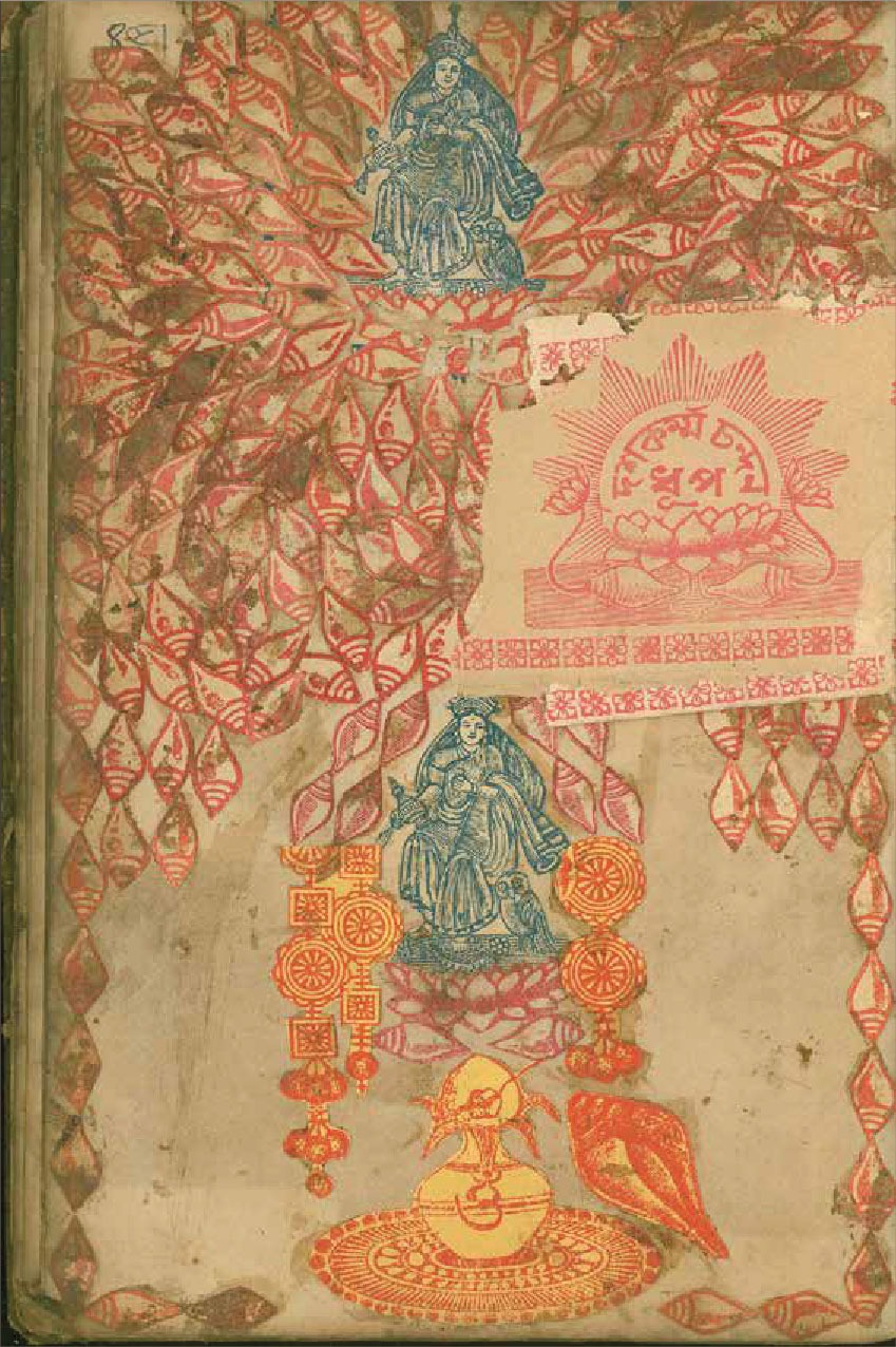 অন্যত্র, দেবদেবীর ছবি ঘিরে প্রদীপের কাট-আউট দিয়ে সাজানো; কোথাও এয়ার মেইলের খামের লাল-নীল ধারের নকশা কেটে নিয়ে ডায়েরির পাতা ফ্রেমের ধাঁচে সজ্জিত হয়েছে। সজ্জার এই কাজ কখনও এতই তীব্র হয়েছে যে, ইন্দুবালার অবসেশন আর নিষ্ঠার ভেদরেখা গিয়েছে মুছে। পৃষ্ঠা ৯১, ৯২ এবং ৯৩ ভরাট করা হয়েছে শতাধিক পদ্মের অণুচিত্র দিয়ে, আর ৪৫ পৃষ্ঠায় এই পদ্ধতি ছাপিয়ে গিয়েছে অন্য সবকিছুকে। মা লক্ষ্মীর কাঠখোদাই ছবি ঘিরে প্রায় শ’-খানেক শঙ্খের অনুচিত্র কেটে যেন ধ্বনির পথ-নির্দেশ করে খাতায় বসানো হয়েছে। সম্ভবত অন্য ছাপাই ছবির ধারের সাজানো অংশ থেকে সংগ্রহ করা। সে সময় উত্তর কলকাতার ছাপাইশৈলীর এসব ছিল অবিচ্ছেদ্য অঙ্গ। সবকিছুর পর বোধহয় তাঁর মনে হয়েছিল একটু ধূপ দিলে সাজানো সম্পূর্ণ হবে। তাই শঙ্খ-পদ্ম-আলোয় উদ্ভাসিত ‘দশকর্ম্ম ধূপ’-এর বিজ্ঞাপন কেটে ওপরে বসিয়েছেন। নিচে সেই লক্ষ্মীর ছবিরই পুনরাবৃত্তি। দু’-দিকে মালা, ঘটের ওপর ডাব, আলপনা, বড় শঙ্খের কাট-আউট শেষে জুড়ে যেন পুজো সম্পন্ন হল।