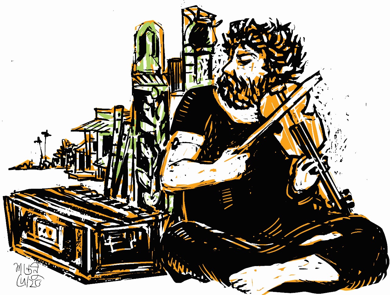 এই গল্প বাজারদা নিজেই বলেছিলেন। তারপর হয়ে দাঁড়াল, সেই হারমোনিয়ামের সাদা-কালো রিড টিপে-টিপে নিজে-নিজেই সুর তোলার নেশা। যেখানে যে গান শুনছে, সবগুলো বাজাতে না-পারা পর্যন্ত শান্তি নেই মনে। এর মধ্যে নতুন তরুণ মনের মানুষ এসে পড়েছে ঘরে, বিয়ে হয়েছে। হাতের কাজ হল কাঠের কাজ করা। সেই কাজেও একইরকম গুণ। হাতের কাজ দেখে লোকের বাড়িতে ডাক পড়ে, কোনওদিন বসে থাকতে হয়নি। কিন্তু মাথার মধ্যে সারাদিন সুরের চলাফেরা। এতখানি দখল হল যে, হারমোনিয়ামের সূক্ষ্ম যন্ত্রপাতি পর্যন্ত খুলে লাগানো শিখে ফেললেন সেই তরুণ বাজার, পরে যিনি তৈরি করতে শিখে যাবেন সাঁওতালদের সবরকম বানাম– সুরযন্ত্র। ছড় টানা কিংবা ঝংকার তোলা, যেমনই বানাম হোক, বাছাই করে নেওয়া একটি কাঠের খণ্ডকে নিপুণ হাতে কুঁদে তোলা নকশা। মানুষের মুখ, পাখি, লতা। তাতে তার বেঁধে, সুর সেধে বাজানো। কিন্তু সে আরও পরের কথা। তার আগে দেখা হল লোকের কাঁধের বেহালার সঙ্গে। হারমোনিয়ামের রহস্য শেখা হয়ে গিয়েছে। সেই হারমোনিয়াম বেচে দিয়ে কেনা হল বেহালা। কিন্তু বেহালায় সুর তোলা কঠিন। রাত্রে ঘরের দাওয়ায় বসে যখন বাজানোর চেষ্টা করতেন, বাজারদার কথামতো, বৌদি বলতেন– আগের যন্ত্রটাই তো ভালো ছিল। এইটা কী বাজনা, ক্ষ্যাপা শিয়ালের মতো শব্দ করে!