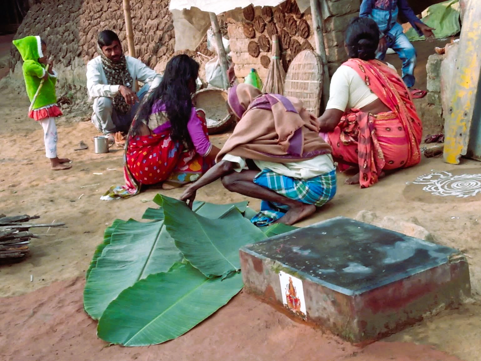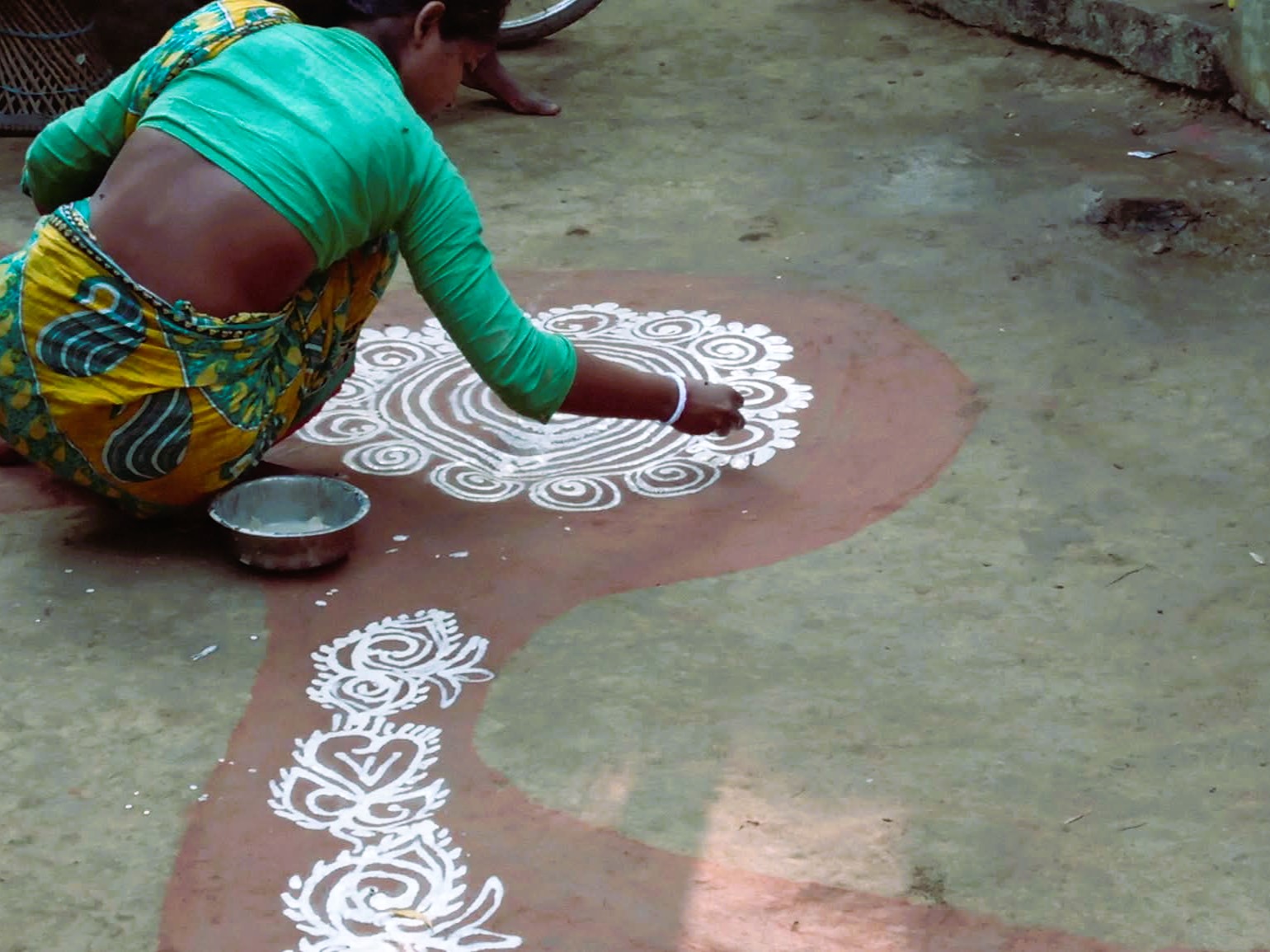 নবানের আগের রাত সাফ-সুতরোর। সবকিছু নতুন চাই। বাসনকোসন মেজে ঝকঝকে তকতকে। নতুন উনুন। সিঁদুর দিয়ে মাঙ্গলিক রেখা টানা সমাপ্ত। উঠোনখানি গোময় মার্জিত। তাতে লাল মাটির গোলা দিয়ে লতাপাতা কাটা। ফাঁকে ফাঁকে আলপনা– শঙ্খলতা, লক্ষ্মীর পদচিহ্ন, গোলা বা মরাই, ধানের শিস, চন্দ্র-সূর্য, গোরু-মোষ ইত্যাদির ছবি। গুহাচিত্রের মতো রৈখিক অবয়বে সাদা রঙের জেল্লা।