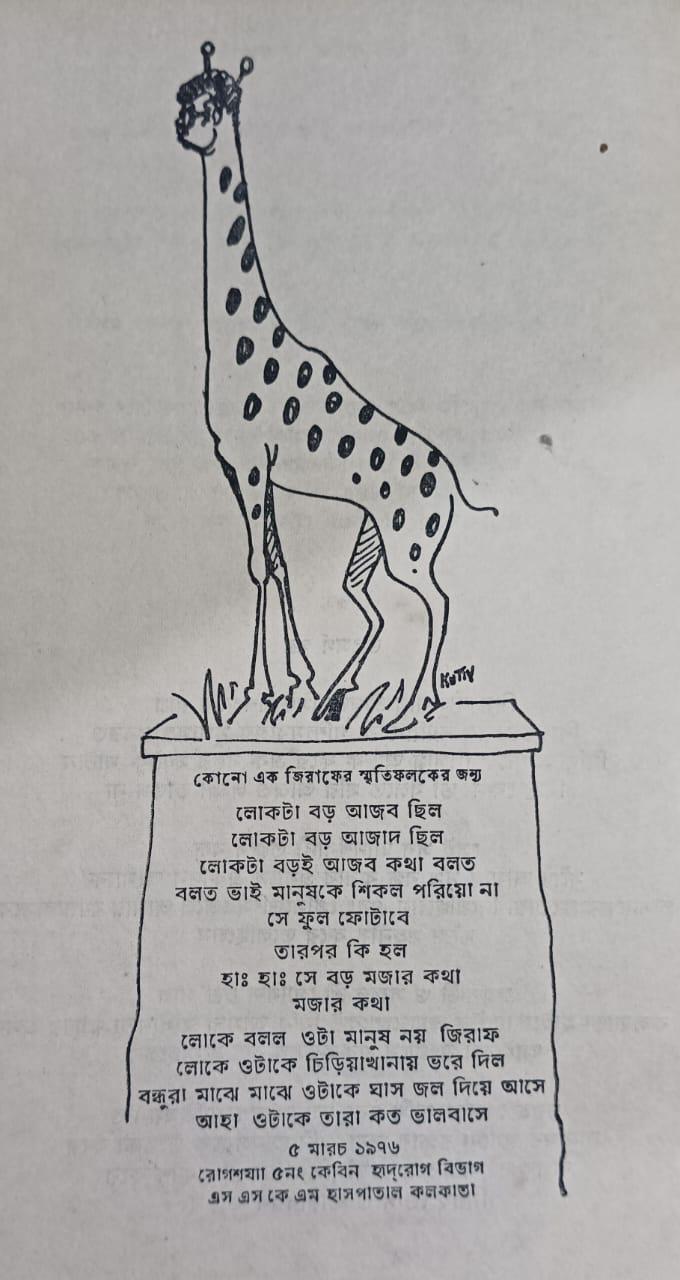 তাঁর এই উৎসর্গ দ্বিতীয় পৃষ্ঠাতে গড়িয়ে গিয়ে কুট্টির আঁকা একটি জিরাফের মুখ ক্রমে গৌরকিশোরের মুখ হয়ে যায়। নির্বাক জিরাফটি একটি স্ট্যাচু, যার স্মৃতিফলকও কম আকর্ষক নয়। সেই ফলকে লেখা হয়েছিল– ‘কোনো এক জিরাফের স্মৃতিফলকের জন্য/ লোকটা বড় আজব ছিল/ লোকটা বড় আজাদ ছিল/ লোকটা বড়ই আজব কথা বলত/ বলত ভাই মানুষকে শিকল পরিয়ো না/ সে ফুল ফোটাবে/ তারপর কি হল/ হাঃ হাঃ সে বড় মজার কথা/ মজার কথা/ লোকে বলল ওটা মানুষ নয় জিরাফ/ লোকে ওটাকে চিড়িয়াখানায় ভরে দিল/ বন্ধুরা মাঝে মাঝে ওটাকে ঘাস জল দিয়ে আসে/ আহা ওটাকে তারা কত ভালবাসে/ ৫ মারচ ১৯৭৬/ রোগশয্যা ৫নং কেবিন হৃদরোগ বিভাগ/ এস এস কে এম হাসপাতাল কলকাতা’।