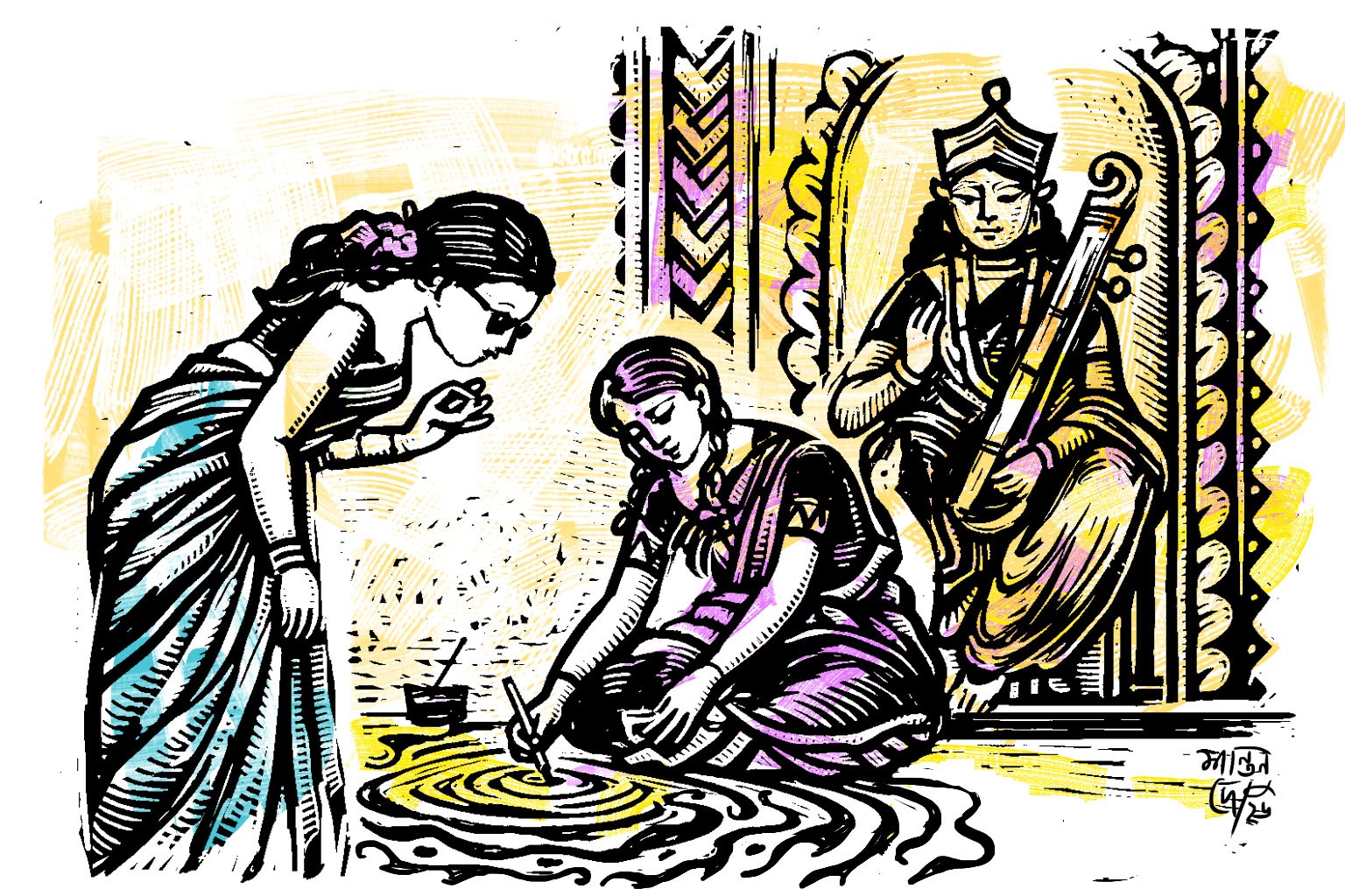 সে তো একটা অত সুন্দর মূর্তি। ওয়ার্ক অব আর্ট। সাজাব না?– এইসব আস্পর্ধাও মঞ্জুর হত ক্লাসের/হস্টেলের বন্ধুদের কাছে। থার্ড ইয়ারের সরস্বতী পুজোয় হোস্টেলের বন্ধুরা একটু আতঙ্কিত, ‘এবারে ওসব করিস না। এটা কিন্তু ফাইনাল ইয়ার।’ তাও ঘুমোলাম রাত জাগার ক্ষতিপূরণে। বেলার দিকে একবার কখন যেন সুমতিদির চোখে পড়েছে অনুপস্থিতি। সকালে একপত্তন আলপনার প্রভূত প্রশংসা হয়ে গেছে তার আগে। উনি থাকতেন কলেজের কাছেই স্টাফ হস্টেলে। এখনকার কথা ঠিক জানি না, আমাদের কালে টিচারদের ব্যক্তিগত জীবন নিয়ে আমাদের কৌতূহল ছিল প্রচুর। বিশেষত ডে-স্কলাররা যেখানে, যা খবর সংগ্রহ করতে পারত, সেগুলো নিয়ে প্রায় আমরা অমরাবতী তোলপাড়ের রোমাঞ্চ অনুভব করতাম। কাজেই একটুও সাজসজ্জা করা বা লাজুক ‘মেয়েলি স্বভাব’ মেয়েদের যে কোনও উপলক্ষে তুলোধোনা করা, সেই তীক্ষ্ণমেধা সুমতিদি যে পুরী বেড়াতে গিয়ে সেখানকার কোনও হোটেল মালিক কিংবা ম্যানেজারকে বিয়ে করে ফেলেছেন, সেই খবর ততদিনে চাপা আগুনের মতো ছড়িয়ে পড়েছে। কিন্তু খোলাখুলি কোনও কথা নেই কোথাও। কেবল দিন পনেরো ছুটির পর রঙিন শাড়ি পরা সুমতিদি ক্লাস নিচ্ছেন। থার্ড ইয়ারের উত্তেজনা প্রায় জ্বরের মতো, কিন্তু প্রকাশ্যে মুখ সকলেরই প্রস্তরবৎ নিরাসক্ত। তো, সেই সরস্বতী পুজোর দিন অঞ্জলি দেবার সময়ে আমার অনুপস্থিতি খেয়াল করে খোঁজ করায় আমার বন্ধুরা ডেকে এনেছে হোস্টেলের ঘর থেকে।