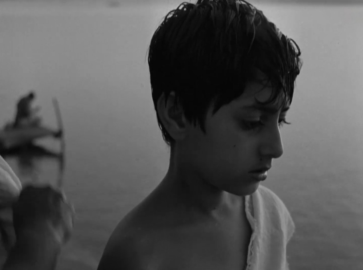[সাউন্ড ট্র্যাক বেজে ওঠে ট্রেনের তীব্র আওতায়। একটি ধারের বার্থ। জানালায় বাইরের দিকে সর্বজয়ার সেই মুখ। কোলে মাথা দিয়ে শুয়ে আছে কিশোর অপু। কাছা পরা।]