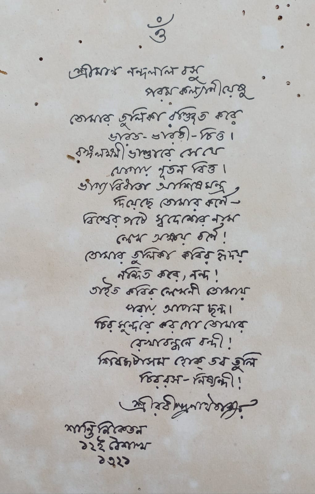 অভিভূত শিল্পী সেদিনের সম্বর্ধনা সভার কথা জানিয়েছেন আমাদের, বলেছেন, “কবি এলেন। আমি ওখানে বসতেই অসিত (হালদার) কিংবা ছেলেদের কেউ মালা দিলে আমার গলায়। কবি আমার হাতে অর্ঘ্য পরে খানিক বললেন। আমি বললুম অল্প।– বিশেষ করে বললুম ‘আমি ধন্য হয়েছি’।” এই সভাতেই রবীন্দ্রনাথ নন্দলালের উদ্দেশ্যে একটি কবিতা পাঠ করেছিলেন। তার শুরুটা এইরকম, ‘তোমার তুলিকা রঞ্জিত করে/ ভারত-ভারতী-চিত্ত।/ বঙ্গলক্ষ্মী ভাণ্ডারে সে যে/ যোগায় নূতন বিত্ত…’ ইত্যাদি। শান্তিনিকেতন আশ্রমের সম্পূর্ণ ভিন্ন পরিবেশ নন্দলালকে মুগ্ধ করেছিল। কলকাতার ‘সোসাইটি অফ ওরিয়েন্টাল আর্ট’-এর নিগড়ে-বাঁধা জীবন থেকে যেন মুক্তির স্বাদ পেয়েছিলেন।