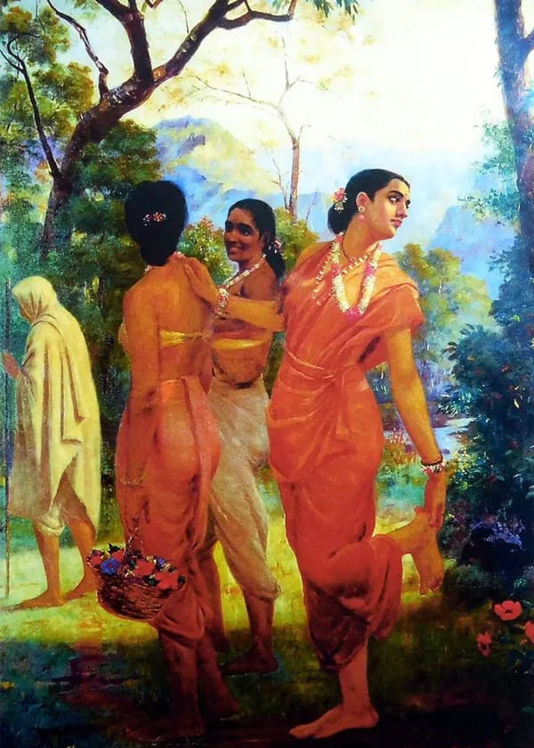রবি বর্মা রাজিবাইয়ের দিকে তাকিয়ে হাসেন। বলেন, আমি আর রাজকন্যা চাই না। তুমি আমার অরণ্যকন্যা শকুন্তলা। তুমি দুষ্মন্তকে খুঁজে বেড়াচ্ছ। তোমার পায়ে হঠাৎ ফুটেছে গাছের কাঁটা। তুমি নিচু হয়ে গোড়ালি থেকে বের করার চেষ্টা করছ সেই কাঁটা। কিন্তু তোমার চোখ থেকে সন্ধান সরে যায়নি। রাজি, তুমি যদি আমার মডেল হও, আমি তোমার মধ্যে আমার শকুন্তলাকে ফুটিয়ে তুলব। আমি আঁকা শুরু করব আমার শকুন্তলা সিরিজের একের পর এক ছবি। এখুনি চলো আমার স্টুডিও-তে। রাজি, এটা ১৮৯৮ সাল। এটাই তোমার দারিদ্রের শেষ বছর।