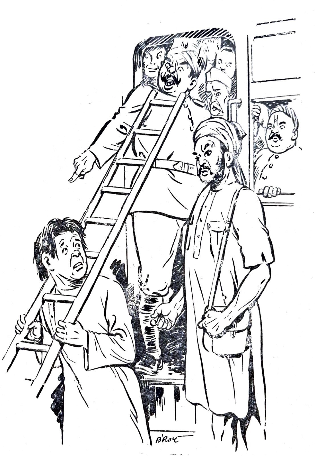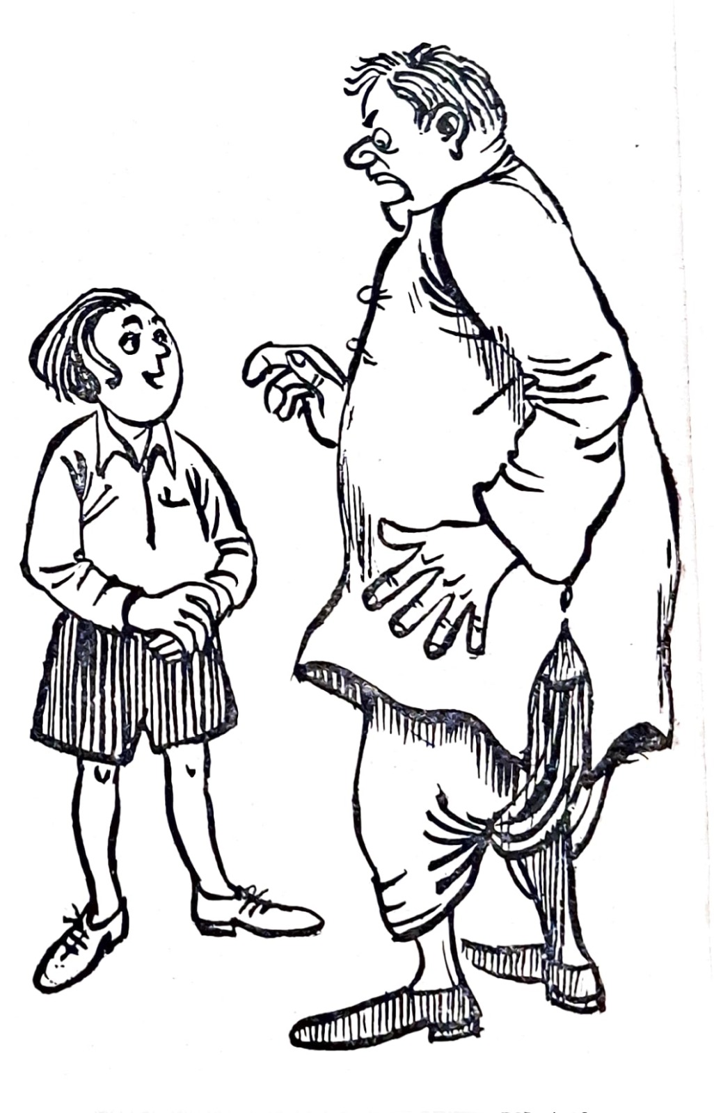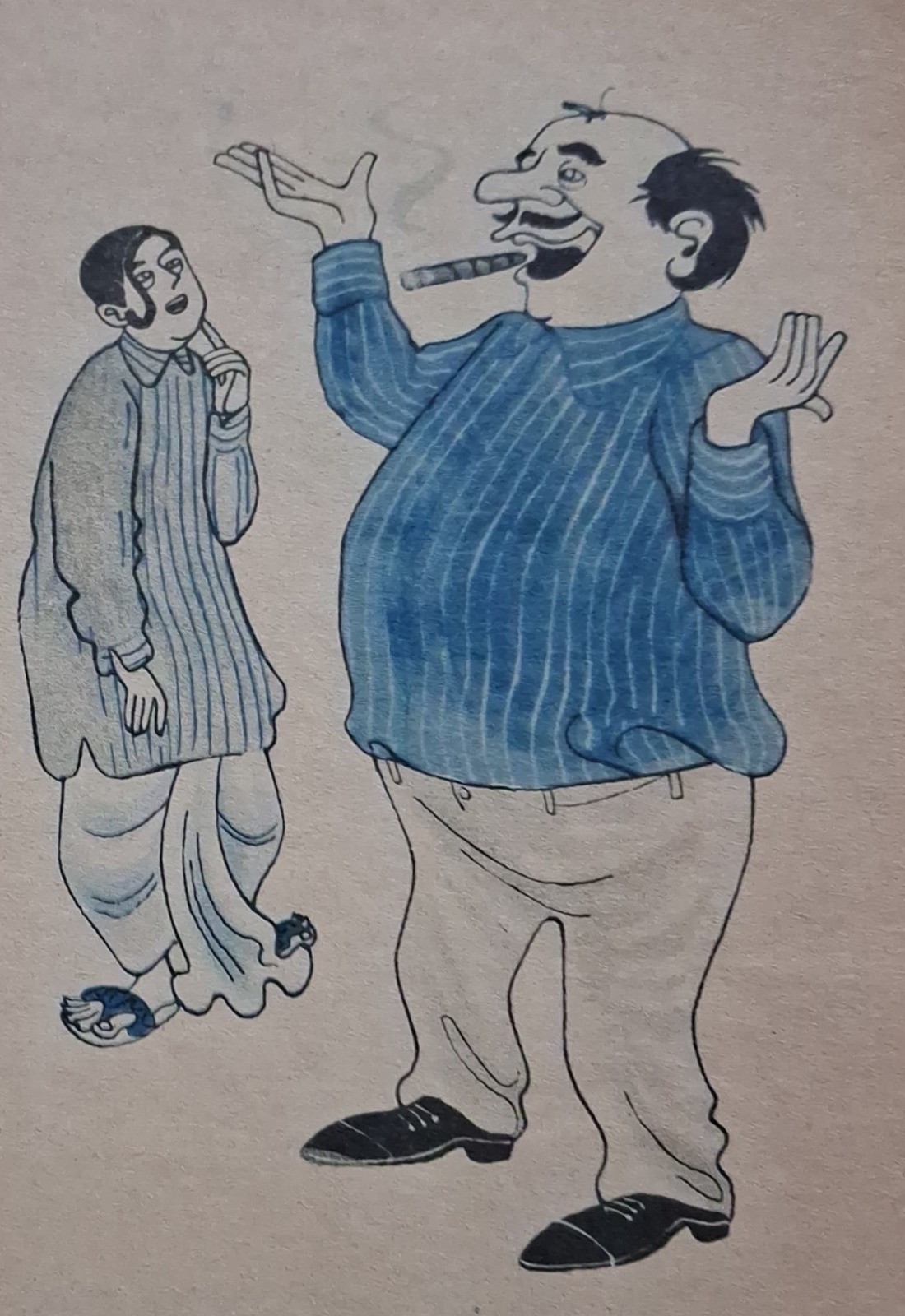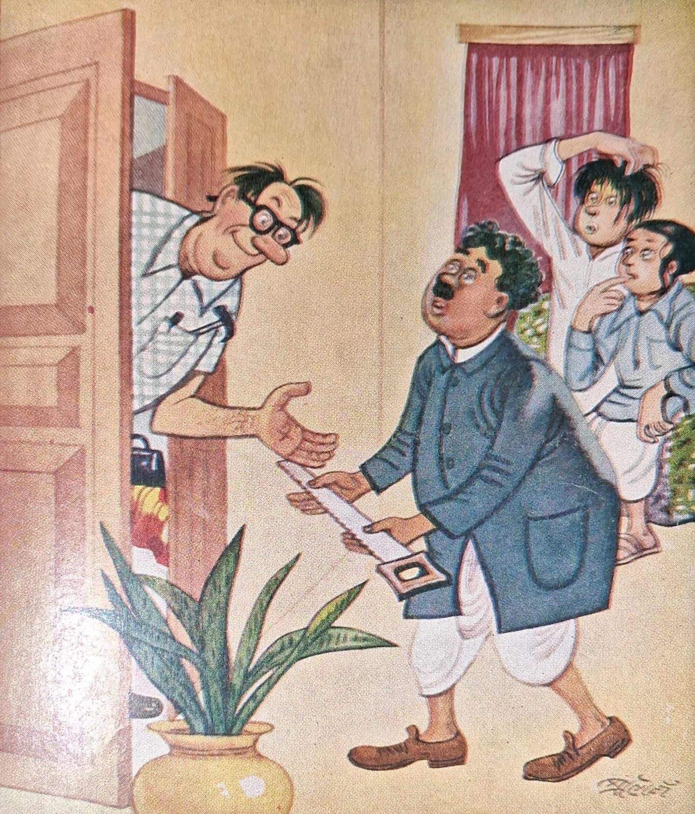 হর্ষবর্ধন-গোবর্ধনের গল্পের সঙ্গে ছবি আঁকার সময় প্রারম্ভিক সন্ধানপর্ব চলেছিল অনুরূপভাবে দীর্ঘদিন। সেই শিল্পী যদি পিসিয়েল-এর মতো দক্ষ ব্যঙ্গচিত্রকর হন, তা হলেও। দি বুক সোসাইটি প্রকাশিত ‘যুদ্ধে গেলেন হর্ষবর্দ্ধন’ (১৩৪৫) বইতে পিসিয়েলকৃত অলংকরণে হর্ষবর্ধনকে দেখা যায় চারটি চেহারায়। কখনও তাঁর মাথায় চমৎকার পরিপাটী-কেশভার, কখনও তিনি টাকসর্বস্ব প্রৌঢ়, কখনও সুদর্শন ধুতি-চাদর পরা মধ্যবয়সি, কখনও বা প্রায় প্রৌঢ় রাশভারী এক ব্যক্তি। আশ্চর্য ব্যাপার এই যে, ‘রংমশাল’ পত্রিকায় প্রায় একই সময় ধারাবাহিকভাবে প্রকাশিত হেমেন্দ্রকুমার রায়ের ‘অসম্ভবের দেশে’ উপন্যাসের অলংকরণে সেই একই ছবি ব্যবহৃত হয়েছে, যদিও দুটি লেখা সম্পূর্ণ ভিন্ন রসের তা পাঠকরা অবগত আছেন। এমনকী শৈল চক্রর্বর্তীও ‘হর্ষবর্ধনের হর্ষধ্বনি’ (ফাইন আর্ট পাবলিশিং, ১৩৪৬)-এ পরিচিত হর্ষবর্ধনকে খুঁজে পাননি– সেখানে মাথাজোড়া টাকসর্বস্ব হর্ষবর্ধন এবং অতি ষণ্ডামার্কা গোবর্ধনকে দেখা যায়।