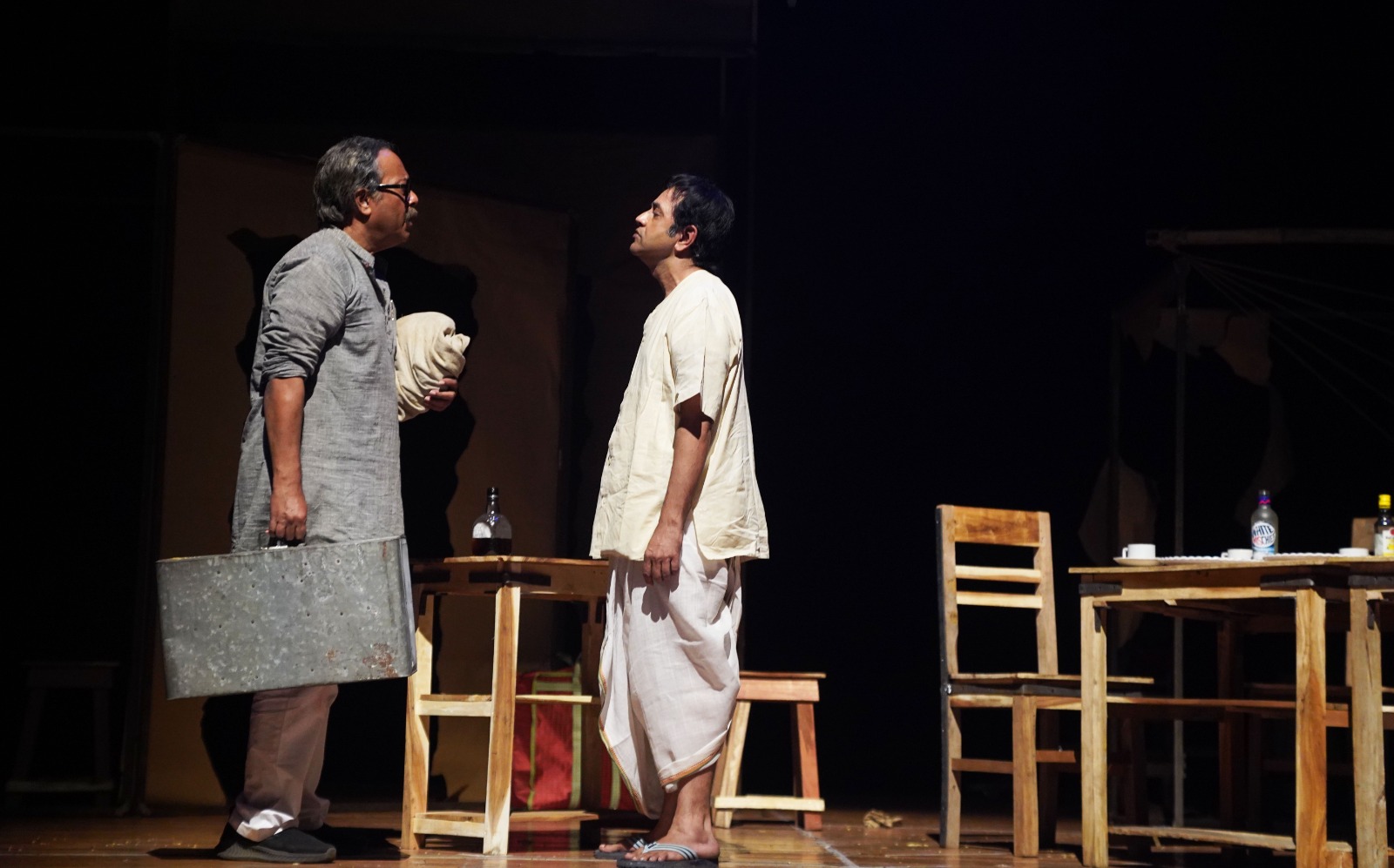 নাট্যমঞ্চের বিভিন্ন কোণ এবং কিনারকে বুদ্ধিদীপ্ত ব্যবহার করেছেন পরিচালক। একদিকে কুয়ো আর অন্যদিকে শয়নকক্ষের বিছানা– এই দুই ভারসাম্য রক্ষাও বেশ উল্লেখযোগ্য। লোকাল ট্রেনের দৃশ্যনির্মাণ এবং প্রয়াণকালে একজন শক্তি থেকে দুই শক্তির আবির্ভাব প্রশংসার আলাদা দাবি রাখে। পরিচালক জানতেন যে, তাঁর পরিকল্পনার আকার সীমিত, খুব বড় মাপের দৃশ্যরূপ থেকে হয়তো সচেতনভাবেই তিনি দূরত্ব তৈরি করেছেন। কয়েকটি ছোটখাটো সমস্যাও তৈরি হয়েছে তার ফলে। যেমন ধরা যাক, মঞ্চের পিছনের অংশটি তিনি প্রায় স্পর্শই করেননি, ফলে আয়তনের খানিকটা পরিসর জুতসইভাবে ব্যবহৃতই হয়নি। অথচ, যদি উচ্চতার খানিকটা, বিশেষত ভিন্ন তলে তুলে নিয়ে যাওয়া যেত, হয়তো কয়েকটি জীবনতথ্য এবং অভিজ্ঞতার বহুস্তরকে ছোঁয়া যেত। অন্যদিকে, বিরতির পর, তাঁর সুযোগ ছিল মঞ্চের মজ্জাটিকে আমূল অথবা আংশিক পরিবর্তন করার। তাতে বিস্তারের একটা আভাসও তৈরি হত।