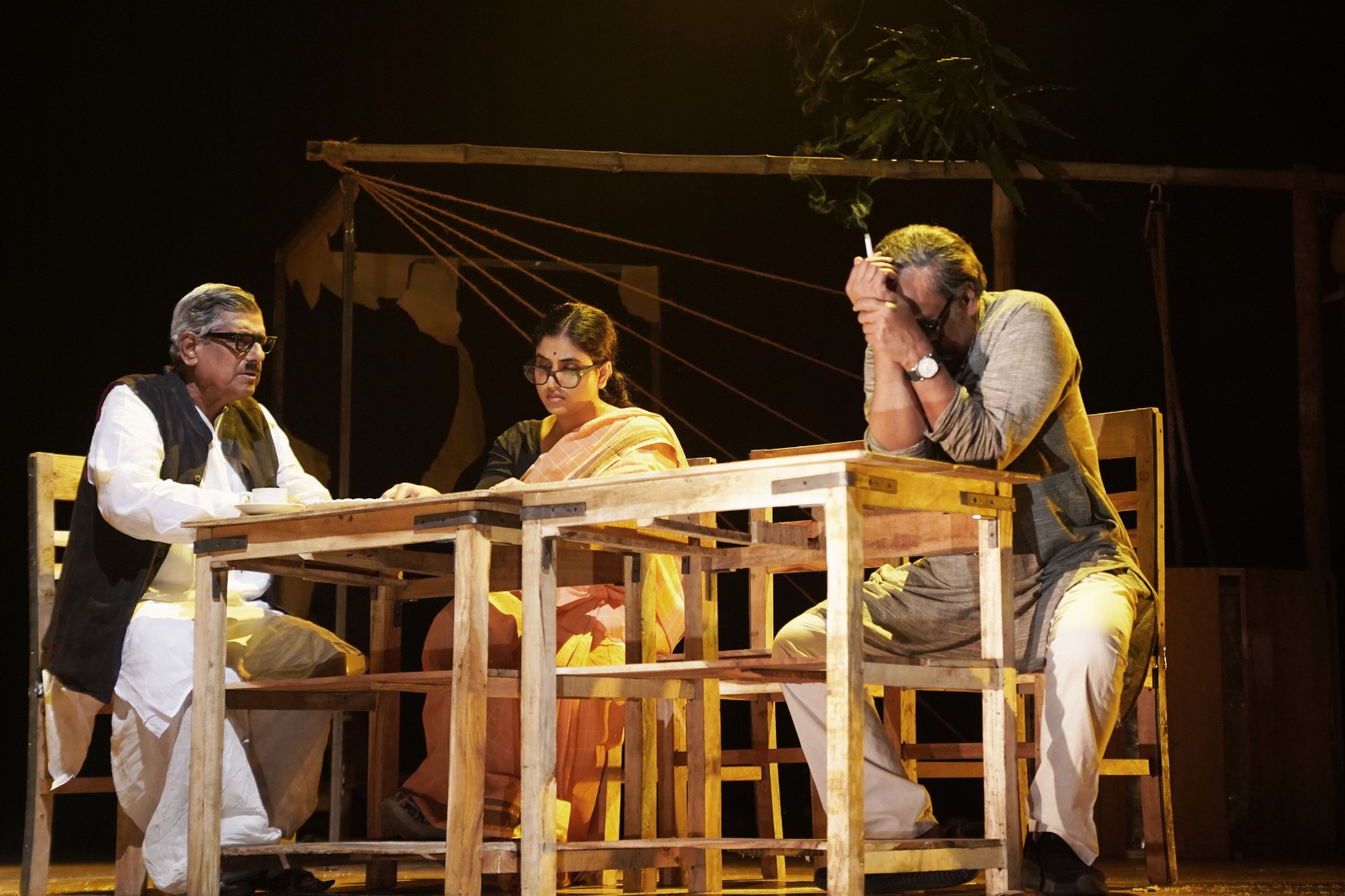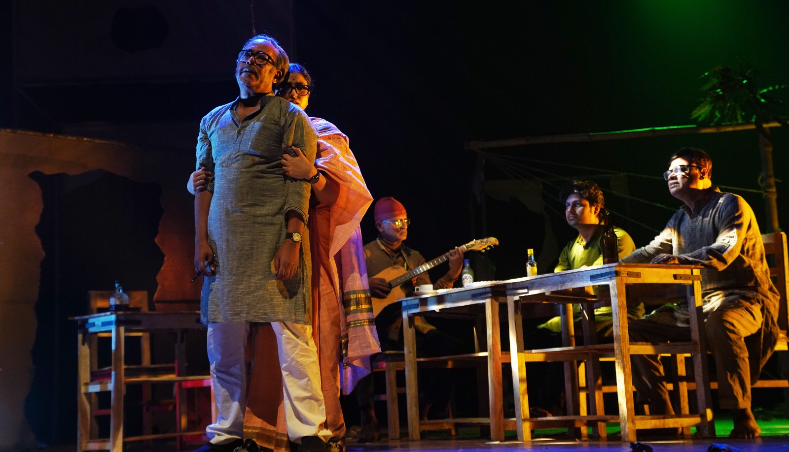 আলাদা করে বলতেই হবে, শক্তি চট্টোপাধ্যায়ের ভূমিকায় দেবশঙ্কর হালদারের কথা। পরিচালক খুব সুনিপুণ কৌশলে নাটকজুড়ে আলোর স্বল্পতাকে বজায় রেখেছেন। সেই আলোছায়ায় দেবশঙ্করের মুখ এবং অভিব্যক্তি অনেক সময় বুক-ছ্যাঁত করে তোলে, স্মৃতিতে। পরিণত বয়সের শক্তি চট্টোপাধ্যায়ের একটা মেক-আপ দিয়েই তিনি বাল্য থেকে প্রৌঢ়তা ধরেছেন। দর্শকের চিত্তপটে সেই অবয়ব মসৃণভাবেই ছাপ ফেলেছে। ‘কলকাতা’ চরিত্রে পার্থ ভৌমিকের কথা আলাদাভাবে বলতেই হবে। তিনি খুব ‘লো-কী’-তে নিচু মাত্রায়, একেবারে সাদামাটা, অতি-সাধারণ, একটু আনমনা চরিত্রটি চমৎকার ধরেছেন। হাতলে জালিব্যাগ লাগানো সাইকেল নিয়ে ঢুকে তিনি সংযত অভিনয় শেষ পর্যন্ত চালিয়ে গেলেন– বিশ্বাসযোগ্য এবং স্বাভাবিক। তিনি একইসঙ্গে এই নাট্যের কথক এবং ভাষ্যকার। তাঁর এই নিচুপর্দার অভিনয়ের প্রেক্ষাপটেই দেবশঙ্কর বহু মুহূর্তে সামান্য চড়া পর্দা ছুঁতেই, শক্তির দামালপনা স্পষ্ট হয়ে গিয়েছে। কোনও অতিরেক বা অতি-অভিনয়ের দিকে যেতে হয়নি। প্রশংসাযোগ্য অভিনয় করেছেন সুনীল গঙ্গোপাধ্যায় চরিত্রে কৌশিক প্রধান। তাঁর ক্ষেত্রেও মুখাবয়বের সাদৃশ্য বেশ চমকে দিয়েছে। তিনি বেশ সুন্দরভাবে বন্ধু-অভিভাবক-সহচর চরিত্রটি ধরেছেন। মীনাক্ষী চরিত্রে অনন্যা মৌ তারিফযোগ্য অভিনয় করে গেলেন। তাঁর গানের গলাটিও বেশ লাবণ্যময়। সাদৃশ্যের মাত্রা স্বাতী গঙ্গোপাধ্যায়ের ভূমিকায় ঈপ্সিতা গাঙ্গুলীর ক্ষেত্রে চমকে দেওয়ার মতো। আমার ব্যক্তিগতভাবে খুবই ভালো লেগেছে দাদুর চরিত্রে দীপেন ভট্টাচার্য এবং রামকিঙ্করের ভূমিকায় চন্দন বিকাশ নিয়োগীকে। আমরা, যারা এইসব নানা রঙের ব্যক্তিবর্গকে চর্মচক্ষে দেখেছি কিংবা দেখছি– তাদের অদ্ভুত একটা অনুভূতি হয়, বাস্তব আর শিল্পিত বাস্তবের সংঘর্ষে। ধরা যাক, তারাপদ রায়, সমীর সেনগুপ্ত, সন্দীপন চট্টোপাধ্যায় এবং এমনকী, সৌমিত্র মিত্রের চরিত্রচিত্রণ দেখলে বেশ একটা মজা পাওয়া যায়। তুল্যমূল্য বিচারে লাভ নেই জেনেও স্মৃতি হাতড়াই। বলতে ভুলেছি, সৌমিত্র মিত্র এই নাটকে নিচু পর্দায় সন্তোষকুমার ঘোষকে ধরেছেন ভালো। আর আলাদা করে প্রশংসা করব মালবিকা মিত্রের পোশাক পরিকল্পনাকে। ২০২৫ সাল থেকে তিনি যেন স্মৃতিরোমন্থনে ফিরে গিয়েছেন সাত বা আট দশকে। সেই কালখণ্ডের সঙ্গে সাযুজ্য রেখেই পোশাক পরিকল্পিত হয়েছে।
