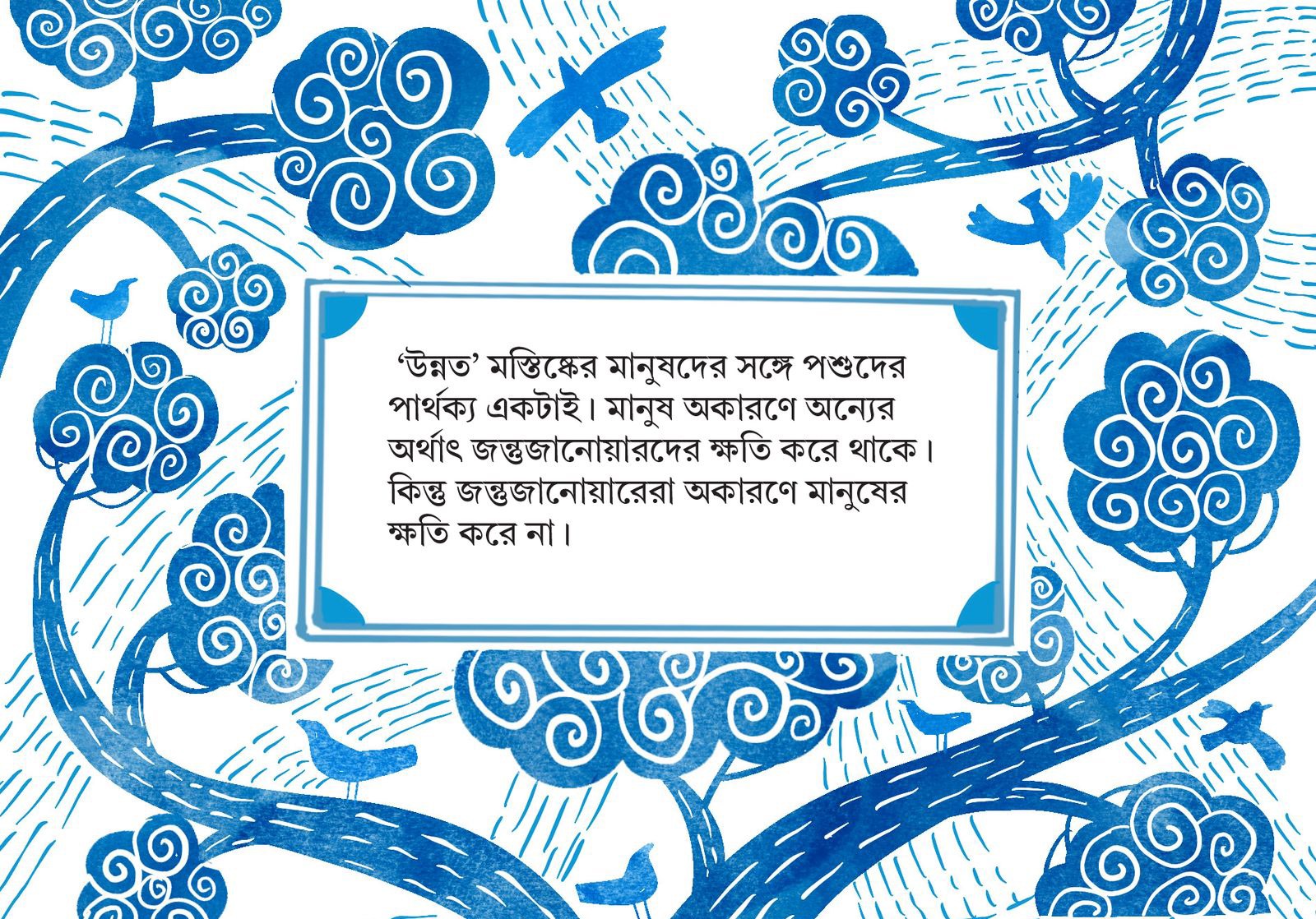 মানুষের পৃথিবী। তাই শিশুর জীবনের শুরুতেই বাংলা ব্যাকরণ বই ভাষার সংজ্ঞা প্রসঙ্গে জানিয়ে দেয়, পশুপাখির ডাক ভাষা নয়। ভৌ ভৌ, গরর্, ফ্যাঁশ, পিক পিক, হাম্বা– কিস্যু না! রিডান্ডেন্ট! অর্থহীন। বরং মানুষের বাগ্মীতা থেকে কাঁচা খিস্তি– ভাষার আওতায় পড়বে সব। অথচ এই সংজ্ঞা তো একথাও বলে যে, ভাষা হয়ে উঠতে গেলে তাকে মনের ভাব প্রকাশ করতে পারা চাই। মা বিড়াল সন্তানকে যে নরম, উষ্ণ শব্দে ডাকে, শত্রুর সামনে রোঁয়া ফুলিয়ে দাঁড়িয়ে তো সে-ভাষা বলে না! রাতপাহারায় বেড়িয়ে কুকুর যে জোরালো ভাষায় নিজের উপস্থিতি জানান দেয়, চিরপরিচিত মনিবের বুকে দুই পা তুলে দাঁড়িয়ে তো সে ভাষা বলে না। বিদ্যুৎপৃষ্ট হয়ে মরা সঙ্গীর দেহ ঘিরে কাকেদের যে জোরালো প্রতিবাদ, তার কর্কশ ভাব খানিক হলেও ফিকে হয়ে যায় আকাশে ওড়ার সময়ে। টুকরো টুকরো ছড়িয়ে পড়ে শূন্য জুড়ে– কা… কা… কা…