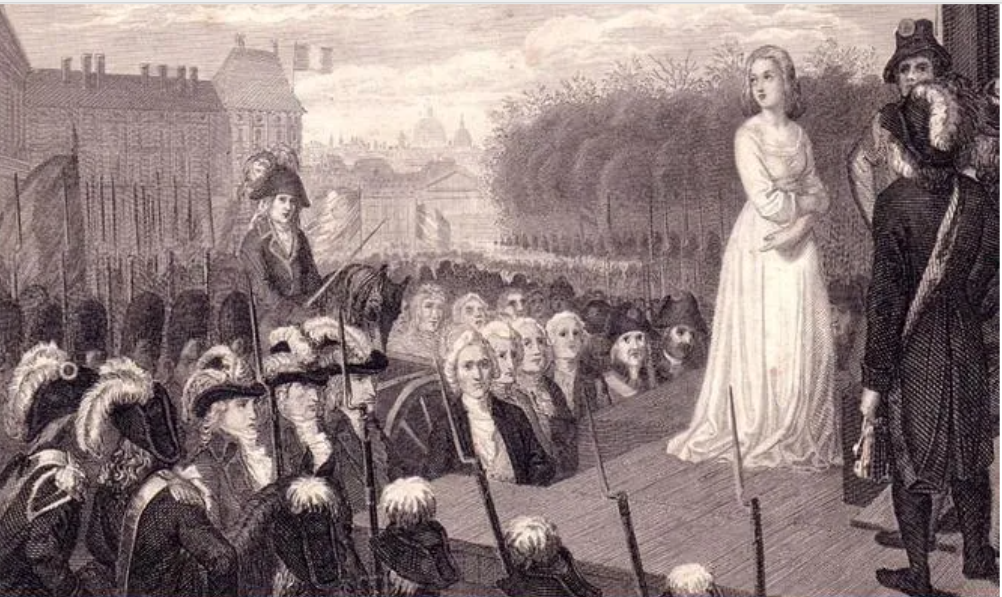এই পরিপ্রেক্ষিতে, এরা তো পক্ষান্তরে সেই রাজতন্ত্রকেই জায়গা দিতে চাইছে– এই ভেবে মধ্যপন্থীদের প্রতি র্যাডিকাল জ্যাকোবিনদের আক্রোশ তুঙ্গে ওঠে। তাই অলিম্পে দ্য গজকেও যখন গিলোটিনে নেওয়া হল, সে আর আশ্চর্যের নয়। দক্ষিণ ফ্রান্সের এক গ্রামের কসাইয়ের মেয়ে মারি গজ নিজে নিজেকে শিক্ষিত করে ‘অলিম্পে দ্য গজ’ নামে মহিলাদের, পুরুষদের সমান ও দাসদের মুক্ত নাগরিকদের সমানাধিকার দাবি করে বেশ কিছু প্যামফ্লেট আর নাটক লিখেছিলেন। সেই লেখাগুলি এই সময়ের ইতিহাস বোঝার জন্য খুবই গুরুত্বপূর্ণ শুধু নয়, যে বিদূষীরা পিতৃতন্ত্র থেকে দাসপ্রথা ধরে সামাজিক আগ্রাসনের বিরুদ্ধে কথা বলছিলেন, কীভাবে তাঁদের কুৎসিতভাবে আক্রমণ করা হয়, তারও দলিল। ফ্রান্সে ও ফরাসি উপনিবেশে দাসদের প্রতি অত্যাচারের বিরুদ্ধে কলম ধরায় ক্রীতদাস ব্যবসা লবি থেকে বলে হয়, ‘মাদাম দ্য গজ সেইসব মহিলাদের একজন, যারা এইসব ভণ্ডামি করে তাদের নারীসুলভ কমনীয়তা এমন হারাচ্ছেন যে ইচ্ছে করে তাদের দাড়ি কামানোর ক্ষুর উপহার পাঠাই।’ আবারও, মন্তব্য নিষ্প্রয়োজন। নাটকের অভিনয় ভাড়াটে গুন্ডা লাগিয়ে বন্ধ করে দেওয়া হয়।