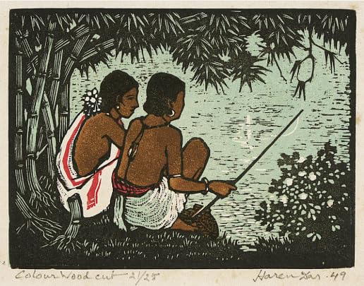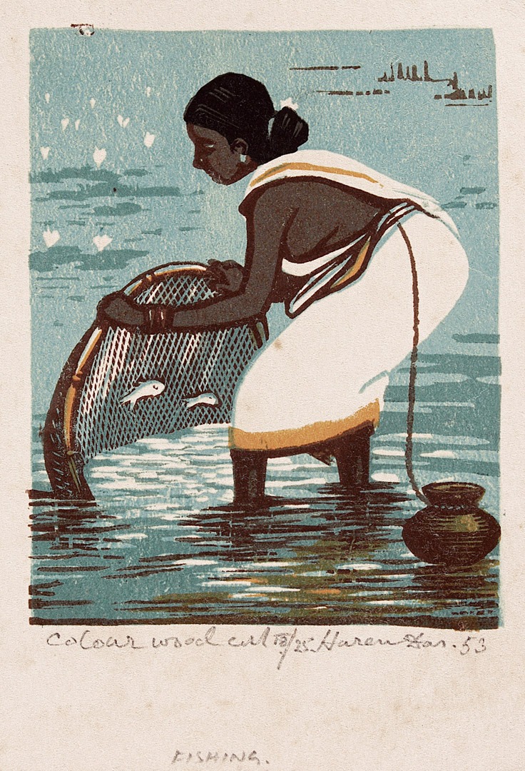 বাংলায় বলা হয়– ‘মৎস্য মারিব খাইব সুখে’। কিন্তু সেই সুখ কি আর একা একা পাওয়া সম্ভব? তাই হরেন দাসের রঙিন ছবিতে দেখি বৃত্তাকার মাছ ধরার জাল হাতে করে মৎস্য-শিকারে চলেছে গ্রামীণ যুগল। খেতে দাঁড়িয়ে যাওয়া বর্ষার জলের মধ্যে থাকা মাছগুলি ধরে জিইয়ে রেখে নিয়ে যাওয়ার জন্য সঙ্গে রয়েছে হাঁড়ি। বৃত্তাকার মাছ ধরার জালের মধ্যে দিয়ে দূরে দেখা যাচ্ছে সুজলা, সুফলা বাংলার প্রকৃতি। সবাই দেখছেন ছবি, আমি দেখছি– অসামান্য এক মাস্টারের হাতের কারিকুরি! ‘উড এনগ্রেভিং’-এর খোদাইয়ের সূক্ষ্ম খেলায় আর জাপানি শিল্পীদের মতো অত্যন্ত কাছাকাছি হালকা রঙের নিপুণ টোনে বাংলার প্রকৃতির নির্যাসকে নিখুঁতভাবে ধরে রাখার প্রয়াস। মাছ ধরার জালের অর্ধস্বচ্ছ বুননের মধ্যে দিয়ে দেখা, প্রকৃতির উপস্থাপনার মধ্যে খুঁজে পাচ্ছি হকুশাইয়ের ‘থার্টি সিক্স ভিউজ অফ মাউন্ট ফুজি’ সিরিজের মাছ ধরা জালের মধ্যে দিয়ে দেখা মাউন্ট ফুজির দৃশ্য। ‘উকিও ই’ মাস্টারকে এইভাবে আত্মস্থ করে, জাপানি এবং ইউরোপীয় পদ্ধতির সংশ্লেষ ঘটিয়ে বাংলার প্রকৃতির এমন উপস্থাপনা আমাকে বিস্মিত করে দেয়!