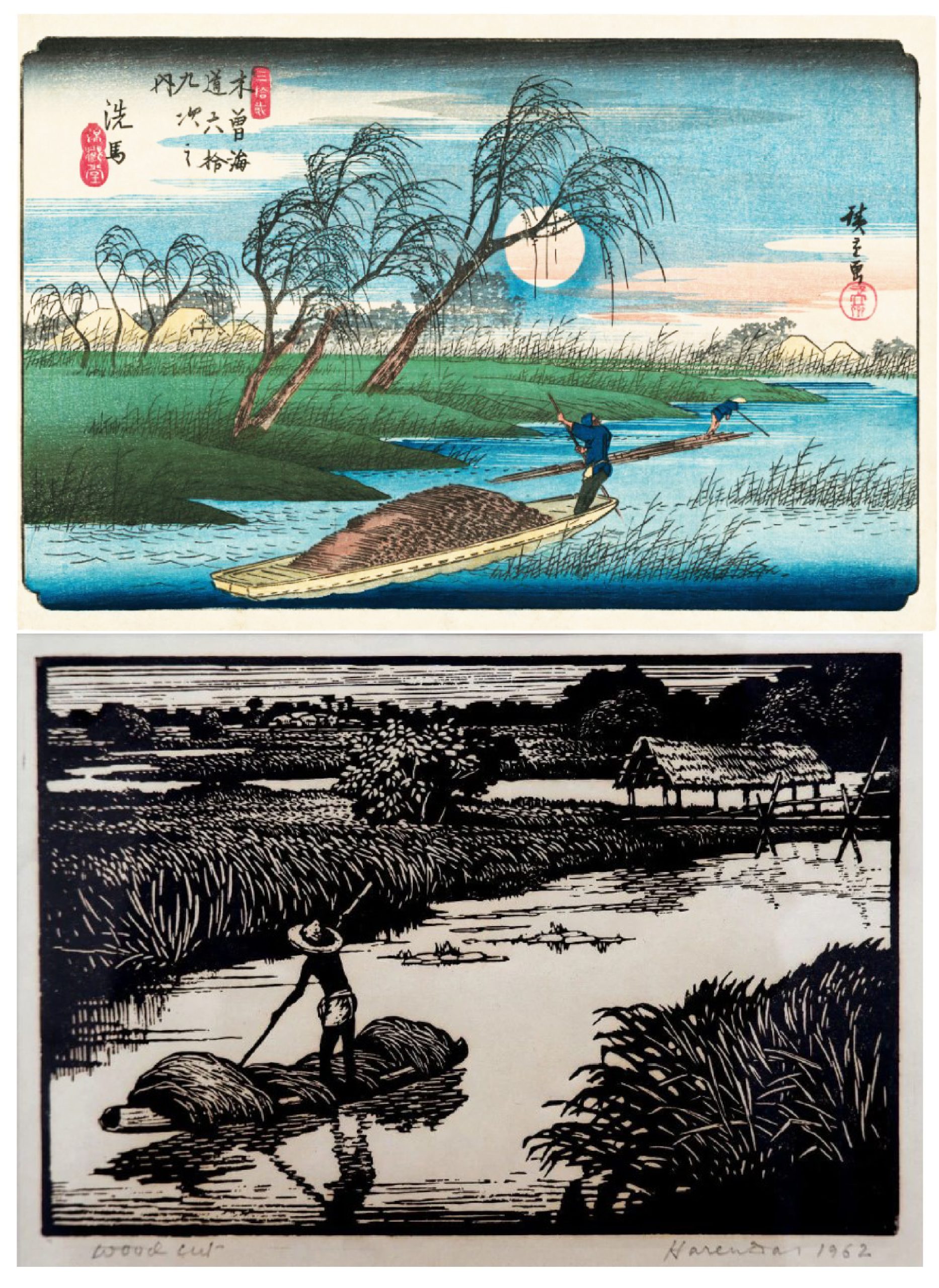 জাপানিদের সঙ্গে বাঙালিদের অন্যতম প্রধান মিল হল– তাঁরা উভয়েই প্রবল রকমের মৎস্যভুক। অতএব দৈনন্দিন জীবনের ভাসমান দৃশ্যাবলি আঁকতে গিয়ে হকুশাই, হিরোশিগের মতো জাপানি শিল্পগুরুদের কাজের মধ্যে যেমন বারবার ফিরে এসেছে জলের ওপর দিয়ে জেলে নৌকা বেয়ে যাওয়া আর মাছ ধরার দৃশ্য, হরেন দাসের ছবির মধ্যেও ঠিক একই ঘটনা ঘটেছে। জেলে নৌকা বা মাছধরার দৃশ্য অতি স্বাভাবিকভাবেই এসেছে বাংলার প্রকৃতি আর মানুষের দৈনন্দিন যাপনের অঙ্গ হিসেবে। হরেন দাসের সরু নদী বা জলাভূমির ওপর দিয়ে একাকী লগি ঠেলে নৌকা বেয়ে চলার ছবি দেখতে দেখতে অবচেতনে শোনা যায় শচীনদেব বর্মনের গলা– ‘কে যাস রে ভাটি গাঙ বাইয়া।’ কিন্তু চমক লাগে এর ১০০ বছর আগে হিরোশিগের রঙিন কাঠখোদাই ছবিতে নৌকা বেয়ে চলা একাকী জাপানি মাঝিকে দেখে। এই আশ্চর্য মিল কি কাকতালীয়? উত্তর মেলে না।