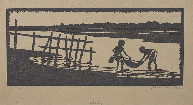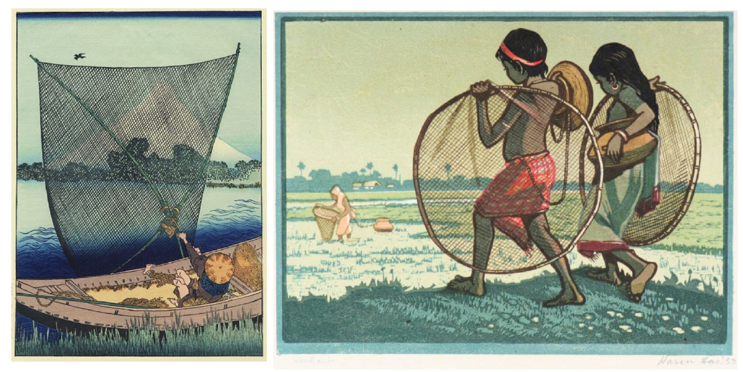 জাপানিদের সঙ্গে বাঙালিদের অন্যতম প্রধান মিল হল– তাঁরা উভয়েই প্রবল রকমের মৎস্যভুক। অতএব দৈনন্দিন জীবনের ভাসমান দৃশ্যাবলি আঁকতে গিয়ে হকুশাই, হিরোশিগের মতো জাপানি শিল্পগুরুদের কাজের মধ্যে যেমন বারবার ফিরে এসেছে জলের ওপর দিয়ে জেলে নৌকা বেয়ে যাওয়া আর মাছ ধরার দৃশ্য, হরেন দাসের ছবির মধ্যেও ঠিক একই ঘটনা ঘটেছে। জেলে নৌকা বা মাছধরার দৃশ্য অতি স্বাভাবিকভাবেই এসেছে বাংলার প্রকৃতি আর মানুষের দৈনন্দিন যাপনের অঙ্গ হিসেবে।