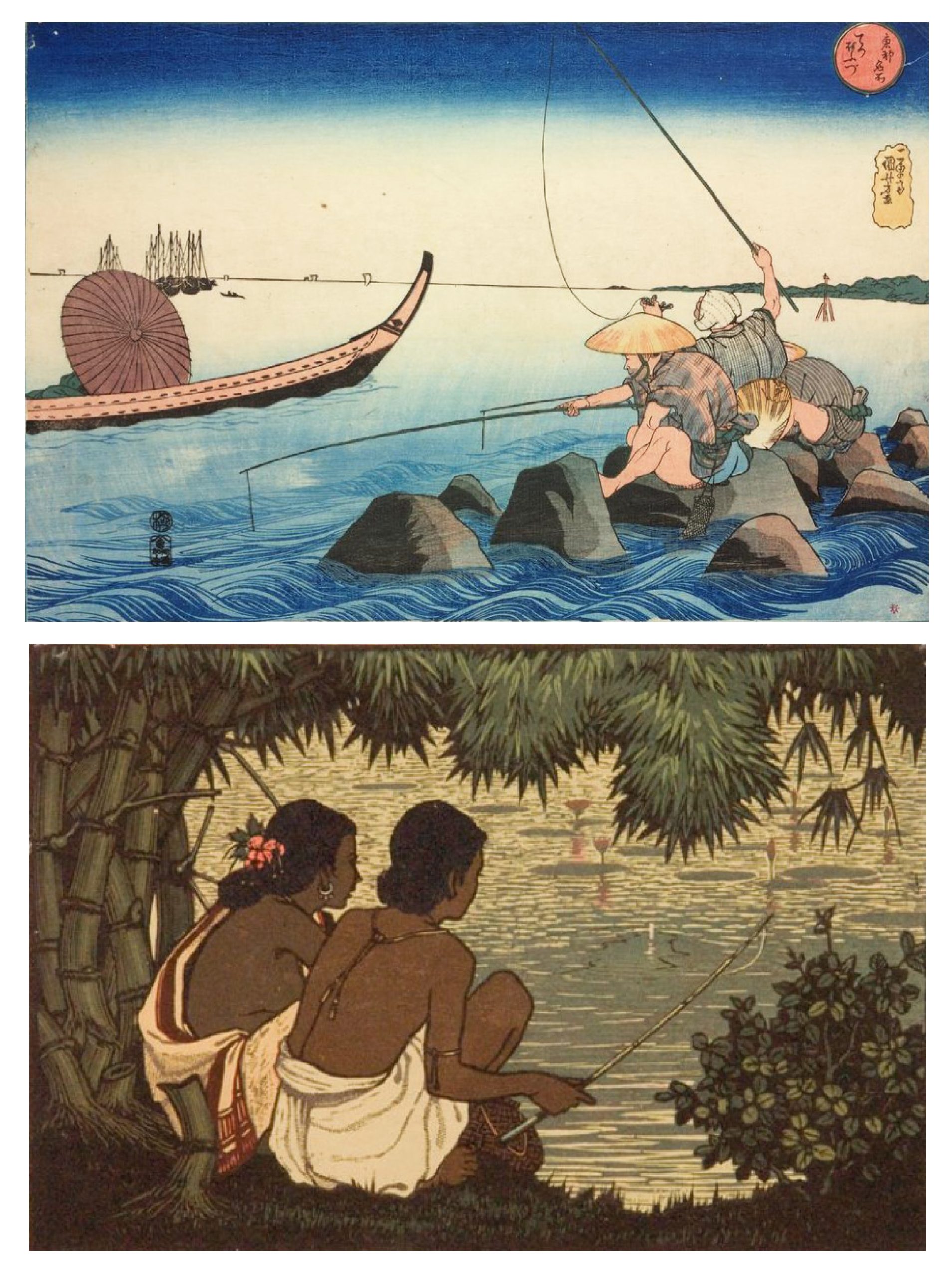 আমি যখন এই বলে খুঁজতে থাকি ‘কী মাছ ধরেছ বঁড়শি দিয়া, ও গুরুজি’ তখন গুরু থুড়ি, গুরুর ছবি বলে, ‘মিথ্যা নয়, চ্যাং ধরেছি গোটা ছয়…’ । ওদিকে আবার ‘দেখুক পাড়া পড়শিতে কেমন মাছ গেঁথেছি বঁড়শিতে’– এই গান গেয়েই আমাদের মহানায়ক গোপন কথাটি সর্বসমক্ষে ফাঁস করে দিয়েছেন। নচেৎ, সেই আদ্যিকাল থেকে মাছ-ধরার ছুতোয় বেশ তো চলছিল অভিসার। হরেন দাসের ছবিতে নির্জন পুকুরের ধারে বাঁশঝাড়ের ছায়ায় প্রিয় মানসীকে পাশে নিয়ে ছিপ ফেলে বসে আছে যে মানুষটি, সে কি কেবল মাছই ধরছে, ভেজে খাবে বলে? অথবা উটাগাওয়া কুনিওশির কাঠখোদাই ছবির সেই জাপানি যুগল? এই মাছ কি সেই মাছ? মাছ ধরার ছুতোয় গোপন অভিসারে যাওয়ায় বাঙালি বা জাপানি– কেউ-ই কম যায় না দেখি।