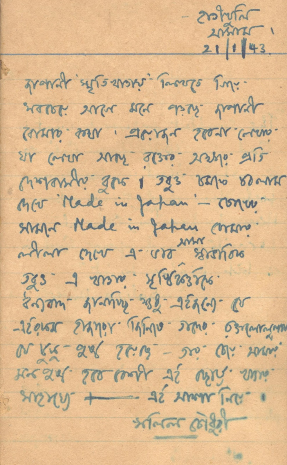 চারের দশকের গোড়ায় সলিল চৌধুরীর তখন নেহাতই প্রথম যৌবন, দক্ষিণ চব্বিশ পরগণার হরিনাভি থেকে কলকাতায় বঙ্গবাসী কলেজে নিত্যদিন পড়াশোনা করতে আসা এক ছাত্র। বামপন্থী রাজনৈতিক বোধে হাতেখড়ি ঘটে গিয়েছে ইতিমধ্যেই। দেশীয় রাজনীতি-দুর্ভিক্ষ-আন্তর্জাতিক যুদ্ধ– সব মিলিয়ে সলিল-সুহৃদ মৃণাল সেনের ভাষায় যা ছিল এক ‘মেটামরফসিস’, তেমন ঘনঘটার ভেতর দিয়ে চোখ-কান খোলা রেখে সলিলেরও প্রহরবৃত্তের ঢেউয়ে সন্তরণ, জাপানি আগ্রাসনের চাক্ষুষ অভিজ্ঞতাও যেখানে সমমাত্রাতেই শামিল। হয়তো তাঁর তৎকালীন সৃষ্ট গানগুলোয় সরাসরি এর অভিঘাত পাওয়া যায় না, তথাপি এক ধরনের ক্রোধ যে নিশ্চিতই গড়ে উঠেছিল চেতনায়, তার আকর নিদর্শন ১৯৪৩-এর নোটবই ‘রত্নকোষ’-এর এই পৃষ্ঠাটুকু। অংশটুকু লিখেছিলেন কোনও ছুটির অবসরে আসামের হাতীখুলিতে বসে, যেখানকার চা-বাগানের চিকিৎসক হিসাবে তখন কর্মরত সলিলের পিতা জ্ঞানেন্দ্রনাথ চৌধুরী। শক্ত মলাট-বাঁধাই ছোট্ট নোটবুকটির ওপরে ‘Made in Japan’– শব্দগুলো যেখানে তাঁকে ভাবাচ্ছে, ভাবিয়ে তুলছে– ‘মাথার ওপর একটা ভয়ঙ্কর কালো আকাশ’-এর চাপকেই শিরোধার্য করে। মানবসভ্যতাবিরোধী শক্তিকে প্রত্যাখানে কলমকেই হাতিয়ার করে নেওয়ার অঙ্গীকারে। সে ছিল এক তরুণমনের ভাবনাচিন্তার গতিপথকে ঠিকঠাক নির্দেশে চালিত করার মকশো পর্ব। যার ক্রম-উত্তরণে জীবন-উপান্তেও সলিল চৌধুরী লিখে গিয়েছেন যুদ্ধের বীভৎসার বিরুদ্ধে শান্তি ফেরানোর অঙ্গীকারের গান– ‘চলছে আজ চলবে কাল/ শান্তির এ মিছিল।/ যত না দিন যুদ্ধবাজ ফেলবে অস্ত্র তার…’।