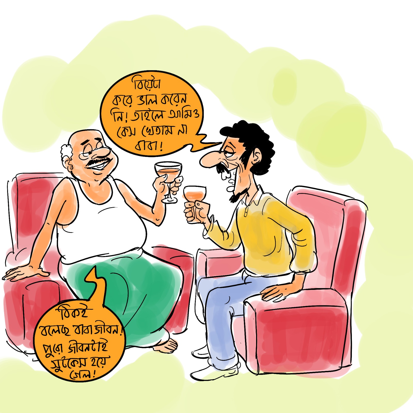 একবার শাশুড়ি ঠাকরুন তাঁর মেয়েকে নিয়ে তাঁর বোনের বাড়ি গিয়েছেন, আর সেটা উদযাপন করতে সন্ধেবেলায় শ্বশুরমশাই আর আমি বৃদ্ধ সাধুর ভজনায় মেতেছি। শ্বশুরমশাই ভজনায় মত্ত হয়ে তাঁর মনের দুঃখ প্রকাশ করতে শুরু করেন। বৃদ্ধ সাধুর ভজনায় শ্বশুরমশাই পৌরোহিত্য করছেন আর তাঁর বুকে এত দুঃখ, সেটা জেনে তন্ত্রধারক হিসাবে আমার একটা দায়িত্ব থেকে যায়। আর সেই দায়িত্ব থেকে আমিও আমার দুঃখ-কষ্টের কথা ব্যক্ত করলাম, আর পরিশেষে বললাম, ‘আপনার বিয়ে করাই ঠিক হয়নি। তাহলে আপনারও বউ থাকত না, আমারও বউ থাকত না– না রহেগা বাঁশ, না বাজেগি বাঁশুরি।’ শ্বশুরমশাই উদ্বেলিত হয়ে উঠলেন আমার কথায় আর দু’জনের জন্য পাতিয়ালা পেগ ঢাললেন। কিন্তু কেলো করলেন যখন কয়েকদিন বাদে শাশুড়ির সঙ্গে বিসম্বাদের সময় আমাকে উদ্ধৃত করলেন। শাশুড়ি বাকরহিত, গিন্নি ক্রন্দনরত– এই পরিস্থিতিতে কোনও আব্বুলিশই কাজ দেয় না। কিন্তু ওই যে আপ্তবাক্য আছে– ‘মদের খেয়ালে, মুতেছি দেওয়ালে’– সেই বেনিফিট অফ ডাউটে ঈশ্বর বোধহয় আমাকে রক্ষা করেছিলেন।