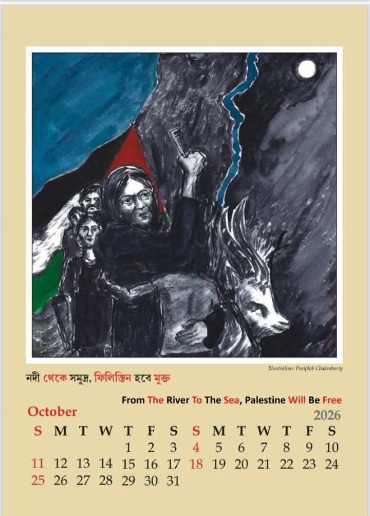 সারা বিশ্ব জুড়ে তাকালেই এখন একটাই দৃশ্য। একটি দেশ আরেকটি দেশকে আক্রমণ করেছে। মানুষ মারা যাচ্ছে, শুধু অস্ত্রের আঘাতে নয়, খাবার শেষ হয়ে না খেতে পেয়ে মারা যাচ্ছে। শুধু সাম্প্রতিক সময়ে নয়, এই দৃশ্য আমরা প্রায় এক দশক ধরে দেখছি। ইরাক যুদ্ধের সময়ের সেই দৃশ্যটা আমাদের নাড়িয়ে দিয়েছিল। সমুদ্রতীরে ভেসে আছে একটি শিশুর মৃতদেহ। তখন থেকে কি না জানা নেই, কিন্তু আওয়াজ বহুদিন ধরে উঠছিল, যুদ্ধ বন্ধ হোক। আজকে রাশিয়া ইউক্রেনের যুদ্ধ বা ইজরায়েলের প্যালেস্টাইনের ওপর আক্রমণের পর নাগরিক সমাজ থেকে এই স্লোগান আবার নতুন করে সামনে এসেছে। যুদ্ধ যে ক্ষতি করছে, যুদ্ধতে যে মানুষের মৃত্যু হয়, তা এখন সাধারণ যে কোনও মানুষ বোঝে। নিজের বা কাছের মানুষের মৃত্যু মানুষকে আজ বাধ্য করেছে এই স্লোগানকে সামনে রেখে রাস্তায় নামতে। সারা বিশ্বের সমস্ত গণতান্ত্রিক মানুষ রাস্তায় নেমে পড়েছে। পরিবেশবিদ গ্রেটা থুনবার্গ, বাংলাদেশের ফটোগ্রাফার শহীদুল ইসলাম-সহ বহু মানুষ নেমে রাস্তায় বলা শুরু করেছে SAY NO TO WAR। ভারত-পাকিস্তানের সীমান্তে উত্তেজনার মধ্যে নতুন করে আবার ঐ স্লোগান ধ্বনিত হয়েছে এই উপমহাদেশের মানুষের মধ্যেও। মানুষ যে যুদ্ধ চায় না, শুধু অস্ত্র ব্যবসায়ী ছাড়া কোনও মানুষের যে যুদ্ধে কোনও লাভ হয় না, তা মানুষ রাস্তায় নেমে প্রমাণ করেছে। তাই ‘যুদ্ধ নয় শান্তি চাই’ হয়ে উঠেছে এই ক্যালেন্ডারের একটি পাতা। এর সঙ্গেই উঠে এসেছে আরো একটি স্লোগান– ‘From the rivers to the sea, Palestine will be free’ অর্থাৎ নদী থেকে সমুদ্র, প্যালেস্টাইন হবে মুক্ত। এই স্লোগানে যেমন আছে আশার কথা, তেমন আছে সাম্রাজ্যবাদের থাবা। দুটোই সত্যি হলেও, মানবমুক্তির আকাঙ্ক্ষা ঘুরে ফিরে এসেছে এই স্লোগানে।