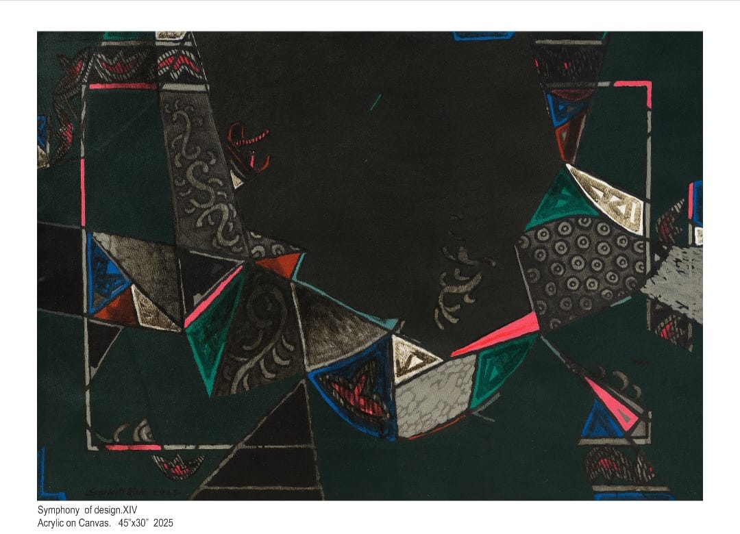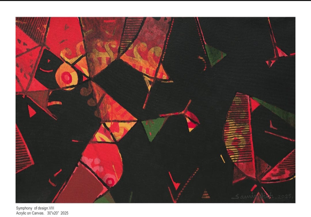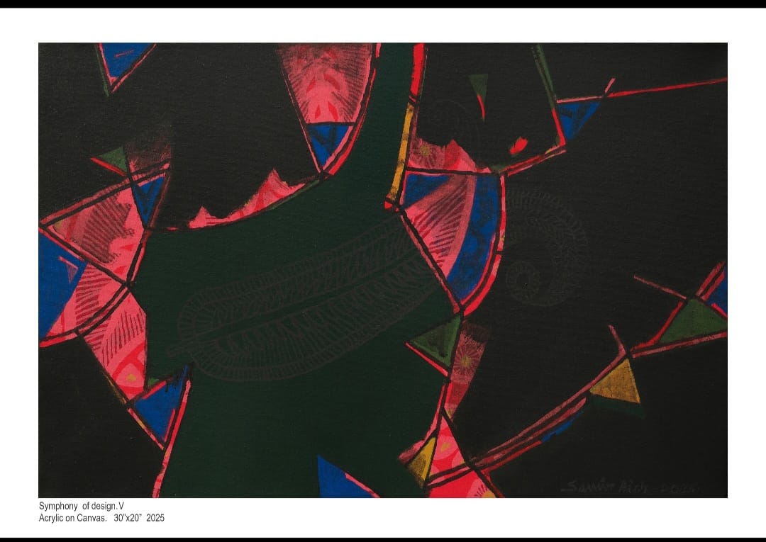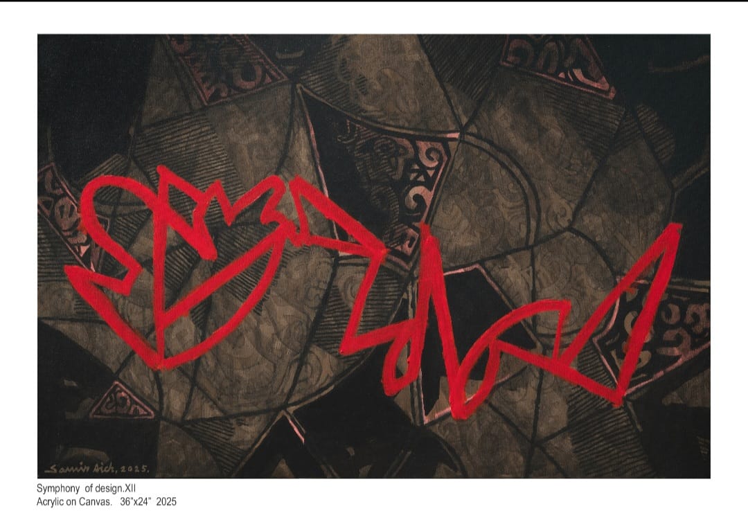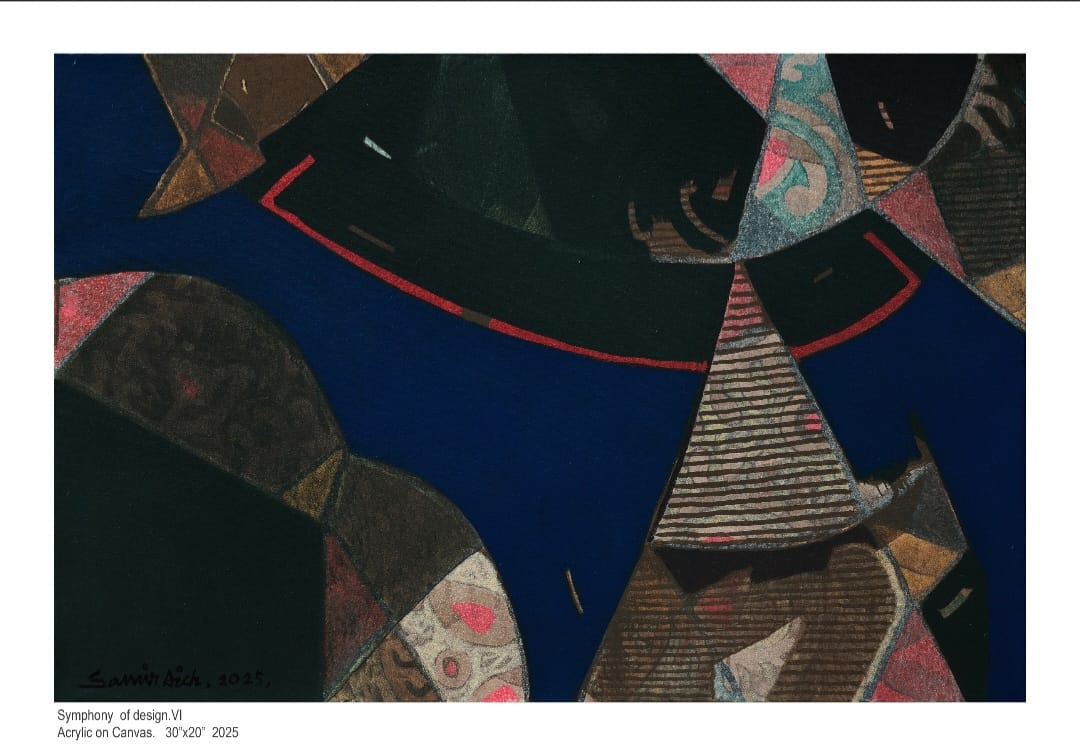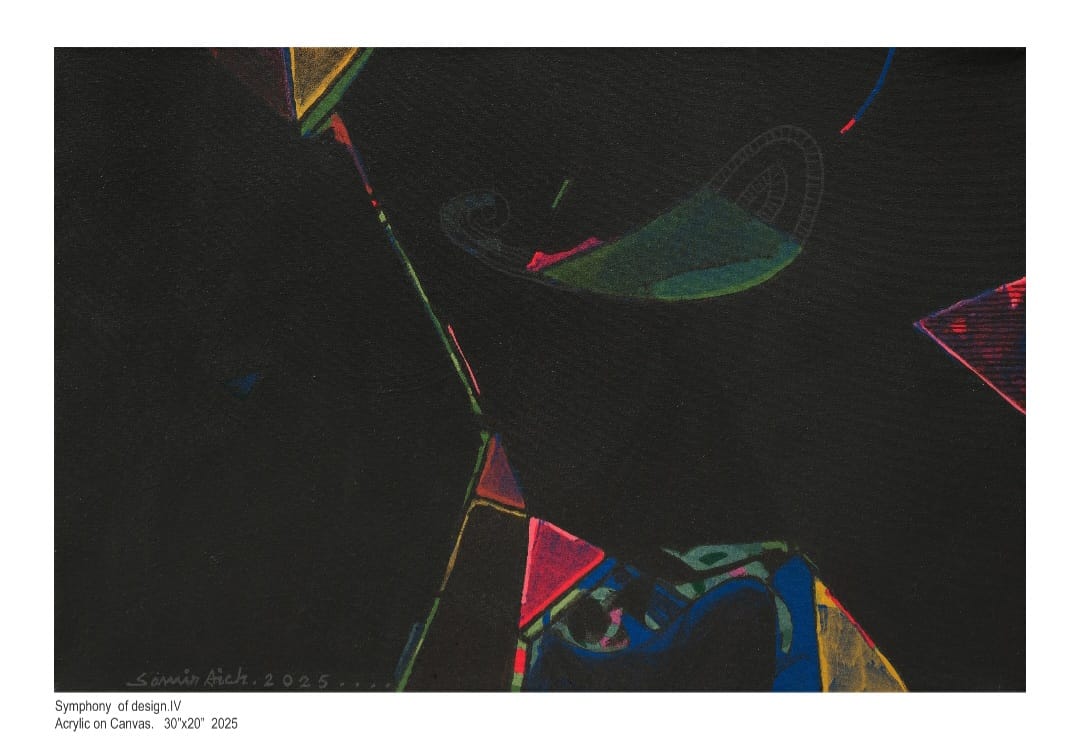 উৎস আলপনা হলেও, সমীর এখানে সেই রূপকল্পকে তাঁর দীর্ঘ শিল্প-উপলব্ধি আর অভিজ্ঞতার মধ্য দিয়ে এক উন্মুক্ত চরাচরে পৌঁছে দিয়েছেন। ছবির প্লাস্টিক ধর্ম অর্থাৎ, ছবির রেখা, রং, স্পেসকে তিনি নিংড়ে নিয়ে এক নতুন চিত্রভাষার জন্ম দিয়েছেন। আলপনার যে সীমাবদ্ধতা সেই পেলব ভঙ্গিকে তিনি দুমড়ে-মুচড়ে এক জ্যামিতিক রূপের সঙ্গে সংমিশ্রণ ঘটিয়েছেন! রেখার লিনিয়রাটি, রেখার সংযোগস্থানে কোণসৃষ্টি কিংবা ত্রিভুজ বা চতুষ্কোণের উপস্থিতি আলপনার রূপকে বর্তমান সময়ের নিষ্পেষণে এক যান্ত্রিক যন্ত্রণাদীর্ণ ফর্মে রূপান্তরিত করেছে! আর তাঁর এবারের কাজের সবচেয়ে আশ্চর্যসুন্দর বিষয় হল, তাঁর ক্যানভাসে স্পেসের বা শূন্যতার ব্যবহার। এইসব ছবিতে যত না রেখা আছে, রং আছে, তার চেয়ে অনেক বেশি অংশ শূন্য করে রাখা আছে। রবীন্দ্রনাথের ভাষায় ‘শূন্য করে ভরে দেওয়া যাহার খেলা’! এই অসামান্য স্পেসের ব্যবহার খুব বড় মাপের শিল্পবোধের পরিচয়, আর এ যেন এক দার্শনিকতা আর ধ্যানময়তাকে স্পর্শ করে ফেলা!