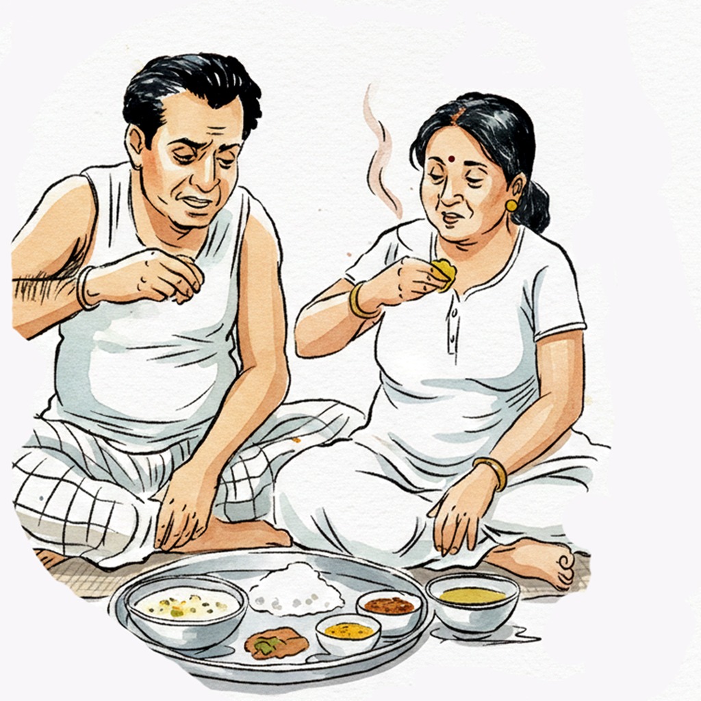 ব্রেকফাস্টের টেবিলে বিম্বিসার। মুখোমুখি রিমি। নরম গলায় বিম্বিসার জানতে চায়, ঘুমোওনি রাতে? রিমি মুঠোজগতের দিকে নিবিষ্ট মনে চেয়ে দেখে, একজন পুরুষ আর একজন মহিলা৷ পাশাপাশি বসে একে অপরের দিকে তাকায়। পুরুষটি বলে, শুরু করছি। প্রথমে মাছের মাথা দিয়ে পুঁইশাক।… খাওয়া চলতে থাকে। বিম্বিসারের দিকে তাকিয়ে উত্তর দিতে গিয়ে রিমি দেখে টোস্টে কামড় দিতে দিতে বিম্বিসারের কানে ইয়ারফোন, চোখ নিজের ফোনের দিকে। রিমি কী মনে করে উঠে গিয়ে তার পিছনে দাঁড়ায়। কী আশ্চর্য! দেখে তার ফোনেও সেই খাইয়ে জুড়ি। পুঁইশাক শেষ। হাত বাড়িয়েছে ইলিশ মাছের দিকে। বিম্বিসারের ডান হাতের আয়ুরেখার শেষে ইংরেজির এন অক্ষরের অবয়ব। এত দিন, এত বছর, সে লক্ষই করেনি। বিম্বিসার পিছন ফিরে তার মুখের দিকে তাকিয়ে একটু হাসে। এক কানের ইয়ারফোন খুলে তার দিকে এগিয়ে দিয়ে বলে, “দেখবে? এরা দু’জনে মিলে খাওয়াদাওয়া করে প্রচুর।”