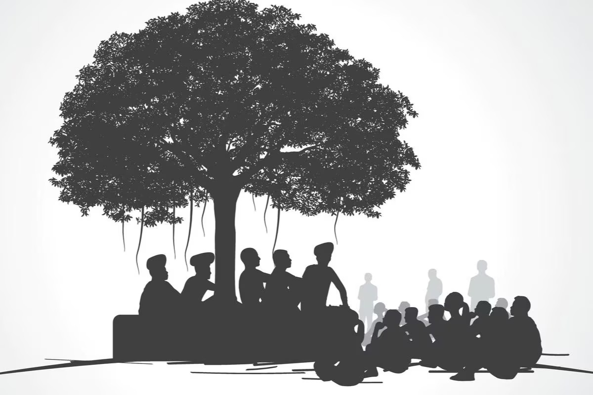 পঞ্চায়েতি সময়ে মণ্ডলের বাড়ির খোলা উঠোনে বসতে হয় বলে মাথার ওপরে একটা চাঁদোয়া টাঙানো হয়। একদা গভীর বনের ভিতরের বস্তি, এখন টাক পড়া জঙ্গল হলেও চারপাশে বৃক্ষ। অরণ্য কম, বস্তি বাড়ছে কিন্তু বন্যপ্রাণ সেসব বোঝে না। তাদের হাজার বছরের পথে চলাচল করে তারা। শামিয়ানার মাথায় পাতা খসে পড়ছে। শীত এখনও ছমছমে। নিচ থেকে দেখা যায়, পাতাগুলির লালচে হলুদ, কমলা সবুজ, বাদামি রঙের ছায়া অপূর্ব নকশা তুলেছে।
