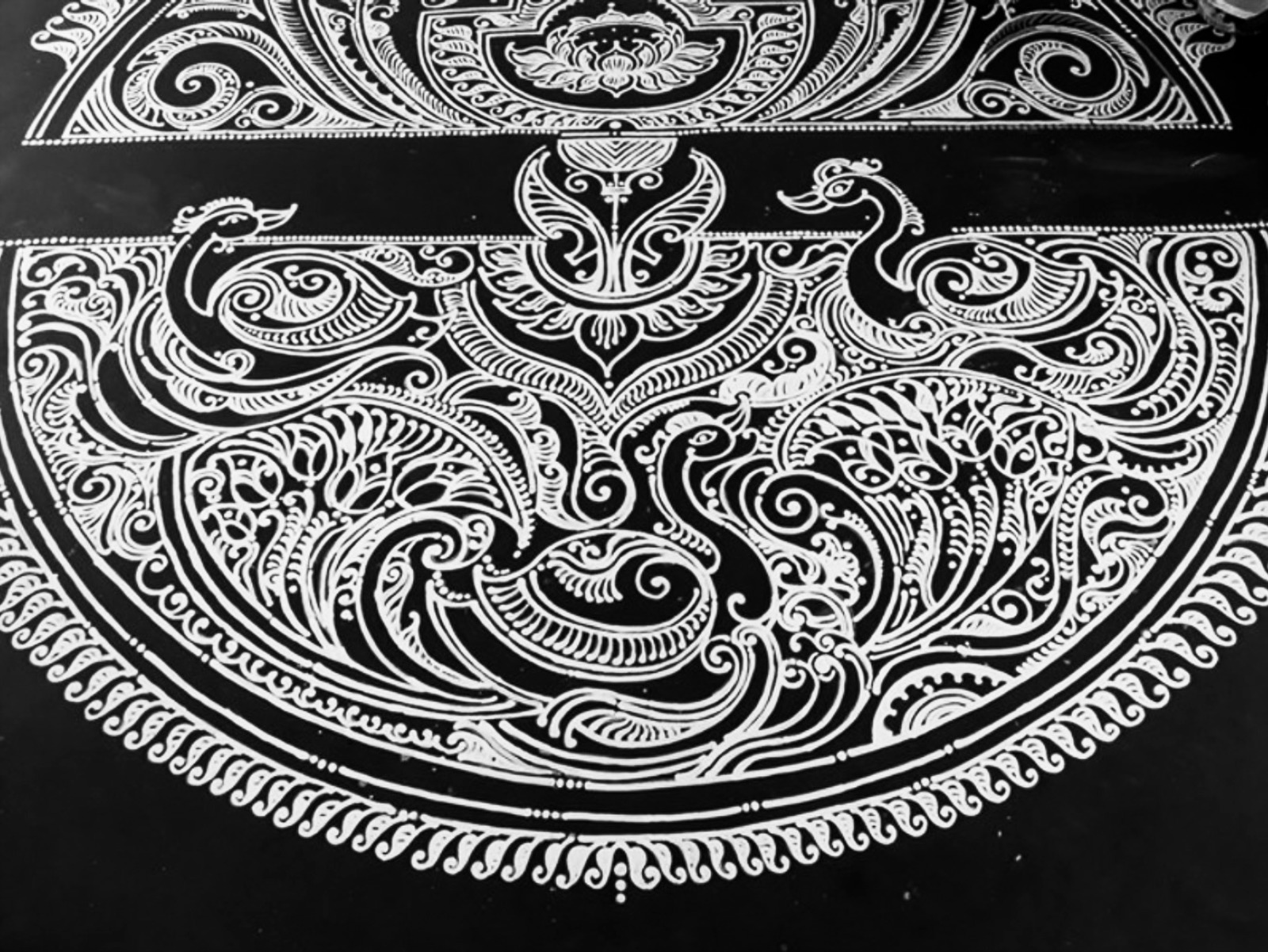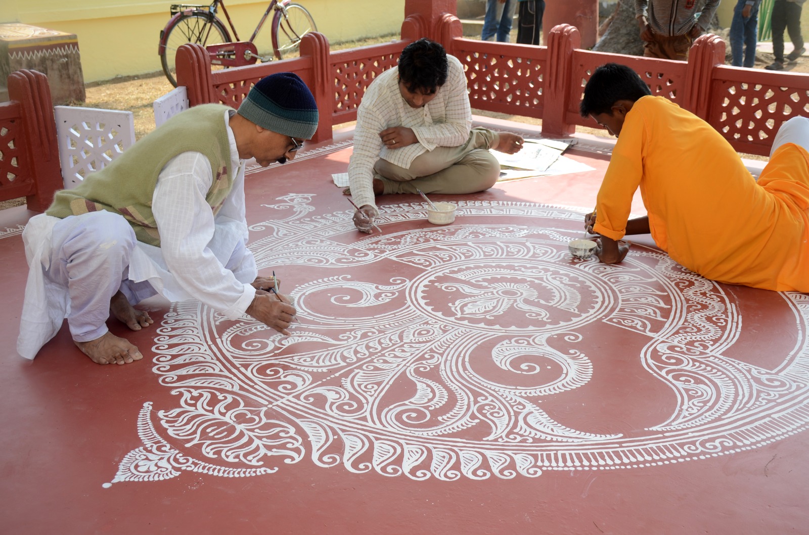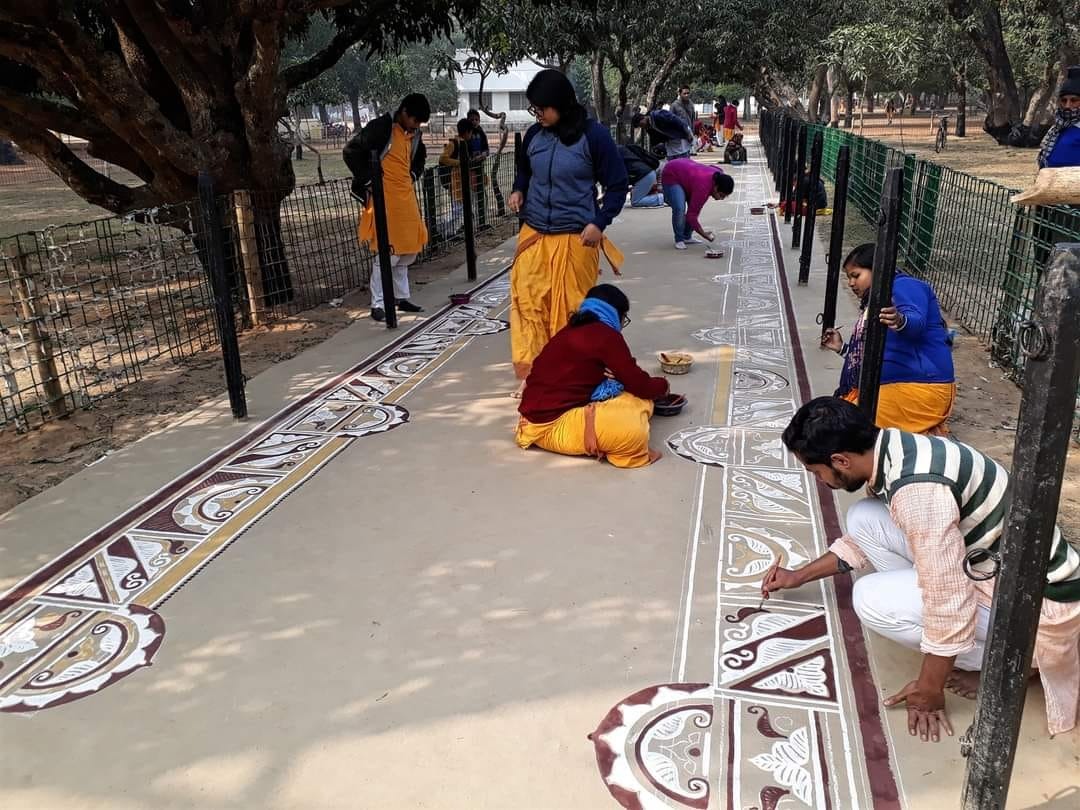 অতীতে এখানে গৌরীদি, যমুনাদি ও অন্যান্য শিল্পশিক্ষকের নেতৃত্বে বৃত্তাকার আলপনা দেওয়া হয়েছে, তা আমরা নানা ছবিতে দেখে এসেছি। পরবর্তীকালে আমরাও সেই পথ অনুসরণ করেছি। সেখানে শিক্ষাসত্রের ছাত্রছাত্রীদের নিয়ে সে এক আনন্দ-উৎসব। খড়ি ও সুতো দিয়ে কম্পাসের মতো বৃত্ত এঁকে কত কি না আঁকাজোঁকা চলত! বৃত্তকে দু’ভাগ করে ওপরের অংশে প্রস্ফুটিত পদ্ম ও লতাপাতা এবং নিচের অংশে জলাশয়ে সঞ্চরণরত হাঁস, জলজ উদ্ভিদের গলাগলি।