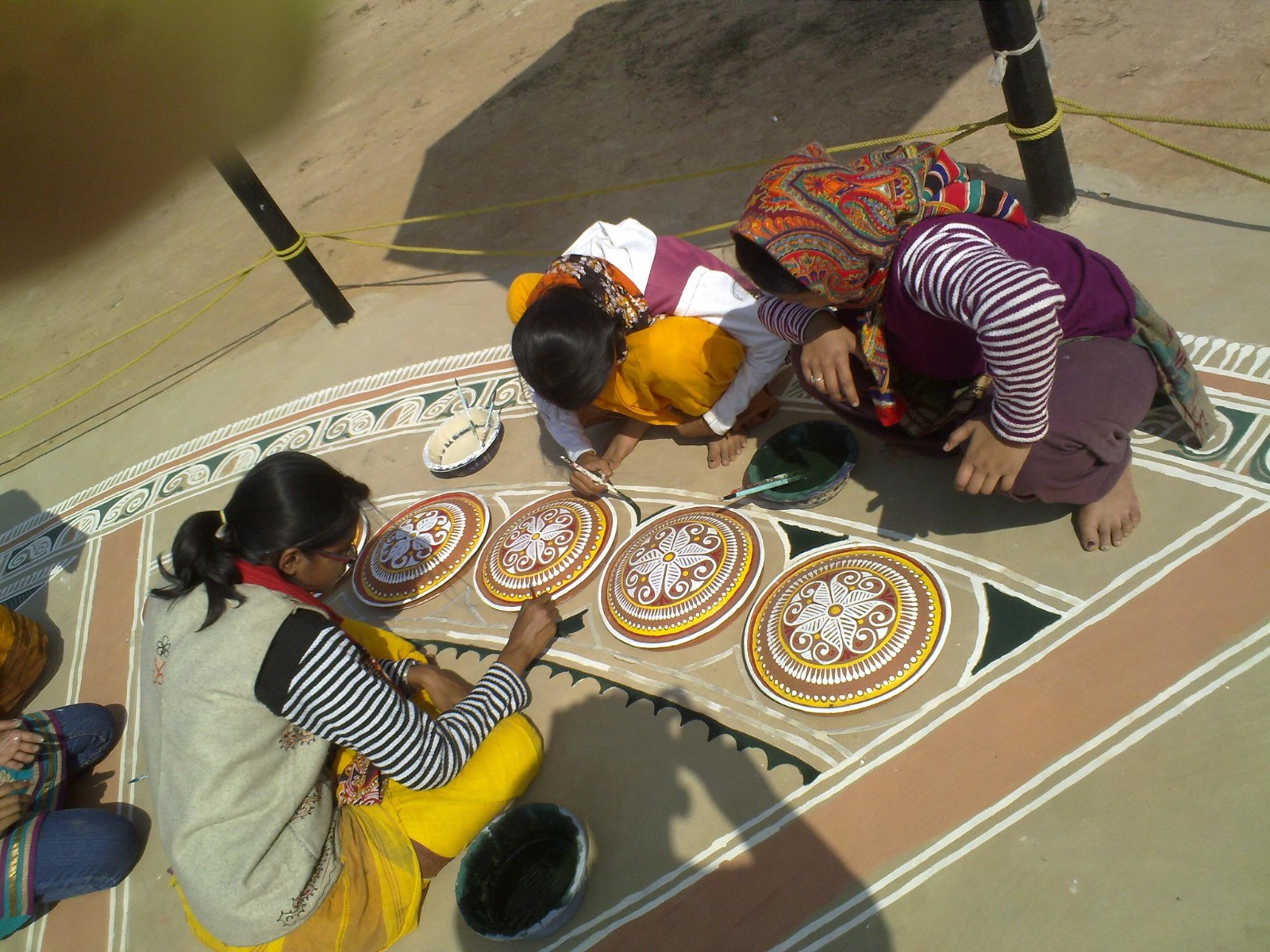 পরের ছবি– ১৯৮৪ সালের সম্ভবত ১৭ ডিসেম্বর। সকাল ৮টার মধ্যেই শিশিরভেজা আম্রকুঞ্জে পৌঁছে গিয়েছি। জহর বেদির সামনে দীর্ঘ প্রশস্ত গোবর-নিকোনো মাটির পথ আলপনার জন্য প্রস্তুত। শিশিরভেজা হালকা নরম মাটি, হালকা সূর্যের আলোয় শুকোতে শুরু করতেই ক্ষমাদি (ক্ষমা ঘোষ) সাদা খড়ি গোলার মালসায় হাত ডুবিয়ে রেখা টানতে শুরু করলেন। ক্ষমাদি থামছেন না। পূর্বপরিকল্পিত কোনও ড্রয়িং ছাড়াই সে রেখা নানা দিকে বাঁক নিতে নিতে এগিয়ে চলল। ভরে উঠতে লাগল দড়ি-খড়ি দিয়ে টানা দুই সরলরেখার মধ্যবর্তী লম্বা প্যানেল। আমি তখন শিল্পশিক্ষক হলেও বিস্ময়ে হতবাক! ছাত্রছাত্রীরা সব একে একে আসতে শুরু করেছে। আমগাছতলায় মহেন্দ্রদা অনেকগুলো মাটির মালসা নিয়ে কোনওটায় এলামাটি গুলছেন, কোনওটায় গেরিমাটি। না, আমি আঙুল দিয়ে পারিনি বা পারতামও না– অগত্যা তুলি দিয়েই মাটি স্পর্শ করলাম।