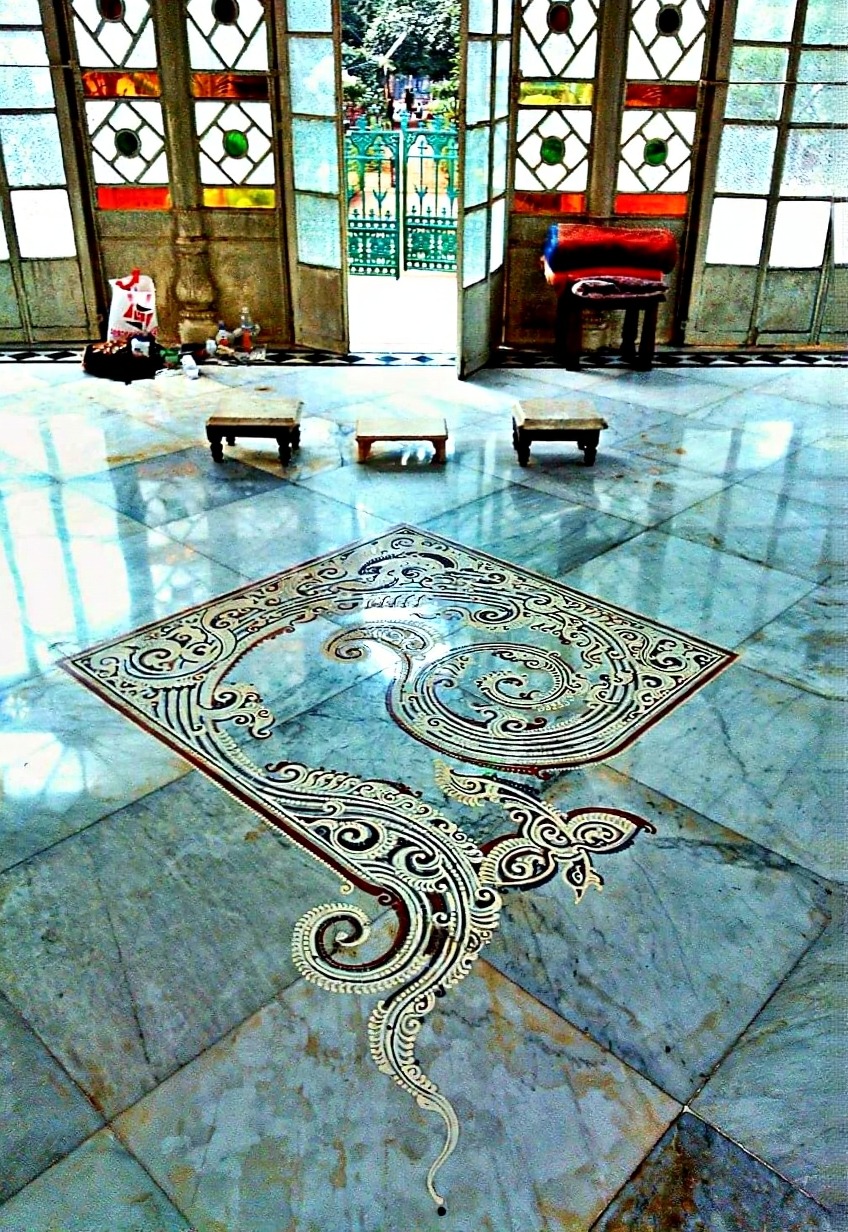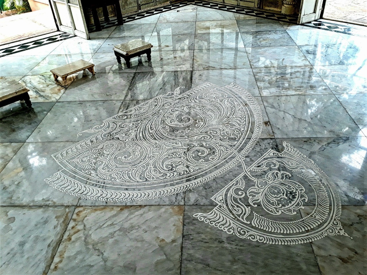রেলিং ও গেট পেরিয়ে উপাসনা মন্দিরে হাতে খড়িমাটি, গেরিমাটি নিয়ে প্রবেশ করেছিলাম ২০১২ সালে। তার আগে মন্দিরে গিয়েছি বহুবার উপাসনার সময়ে। প্রতিটি উপাসনা চলাকালীন সংগীত ও মন্ত্রোচ্চারণের সঙ্গে সঙ্গে যে ভাবান্তর ঘটে, তা এক বিশেষ অনুভূতি। ২০১২-র শীতেই খ্রিস্টোৎসবের জন্য আলপনা দেওয়ার ডাক পড়ল। আমি তখন একা মন্দিরে প্রায় সারাদিন। চারপাশের কাচ ছেঁকে সূর্যালোকের রঙিন প্রতিফলত শ্বেতপাথরের মেঝের ওপরে। মহর্ষি এই মন্দির পরিকল্পনার সময় ভেবেছিলেন সূর্যাস্তের আলোর প্রতিফলন যেন এই উপাসনাগৃহকে আরও মহিমান্বিত করে তোলে।