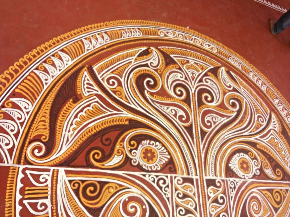 অতীতে এখানে গৌরীদি, যমুনাদি ও অন্যান্য শিল্পশিক্ষকের নেতৃত্বে বৃত্তাকার আলপনা দেওয়া হয়েছে, তা আমরা নানা ছবিতে দেখে এসেছি। পরবর্তীকালে আমরাও সেই পথ অনুসরণ করেছি। সেখানে শিক্ষাসত্রের ছাত্রছাত্রীদের নিয়ে সে এক আনন্দ-উৎসব। খড়ি ও সুতো দিয়ে কম্পাসের মতো বৃত্ত এঁকে কত কি না আঁকাজোঁকা চলত! বৃত্তকে দু’ভাগ করে ওপরের অংশে প্রস্ফুটিত পদ্ম ও লতাপাতা এবং নিচের অংশে জলাশয়ে সঞ্চরণরত হাঁস, জলজ উদ্ভিদের গলাগলি। বেলা যত বাড়ত, অলিপনার খড়িগোলার রেখা দুধের মতো সাদা হয়ে ফুটে উঠত। বেলার হালকা উষ্ণতায় ঘর্মাক্ত কলেবর হয়ে উঠি। সেই সময় একবার কোনও ছাত্র এসে খবর দিল যে, শ্যামবাটিতে না ক্যানেলপাড়ের এক পলাশ গাছে দু’-তিনটে পলাশ দেখা গেছে। হাতে তখন আমার হলুদ এলামাটির সরা– তাতে কয়েক ফোঁটা লাল গেরি মাটিগোলা ফেলে দিলাম। পলাশ ফুটে উঠল আলপনায়।