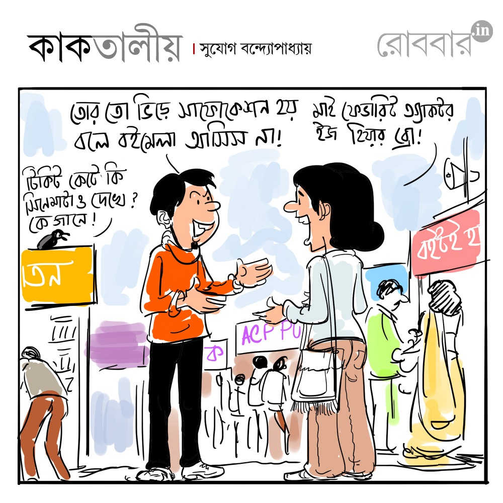 ‘ইউ নো, আই ওনলি লাইক দিস ফিল্ম অফ হিজ– নায়ক। উত্তমকুমার লিটারালি আউটপার্ফমড্ হিমসেল্ফ, তাই না?’, নব্যযুবা একজনের উড়ো মন্তব্য কানে আসে। মতান্তর থাকতেই পারে, তবে ২০২৬-এর বইমেলা বাণীপ্রধান। আদ্যিকালের সাইনবোর্ডের ধাঁচে হাতে লেখা (অথবা ছাপানো) অভিনব সব সংলাপ মেলার চারিদিকে! ‘বই কিনলেই নাকি খিদে পায়’– তেমনই এক ব্যানারের দাবি। নিমেষে পুরনো একখানি মন্তব্য ভুস করে ভেসে ওঠে মনে– ‘সবাই যায় বইমেলায়, বই না কিনে দেদার খায়।’ লোক থইথই মেলায় তারাপদ রায়ের লেখার সেই বিখ্যাত পাগলের কথা মনে পড়ে যায়– যে বইমেলার বাইরে দাঁড়িয়ে মেলা থেকে বেরনো প্রতিটি লোককে জিজ্ঞেস করত, ‘এত বই কে কিনবে? এত বই কে পড়বে?’