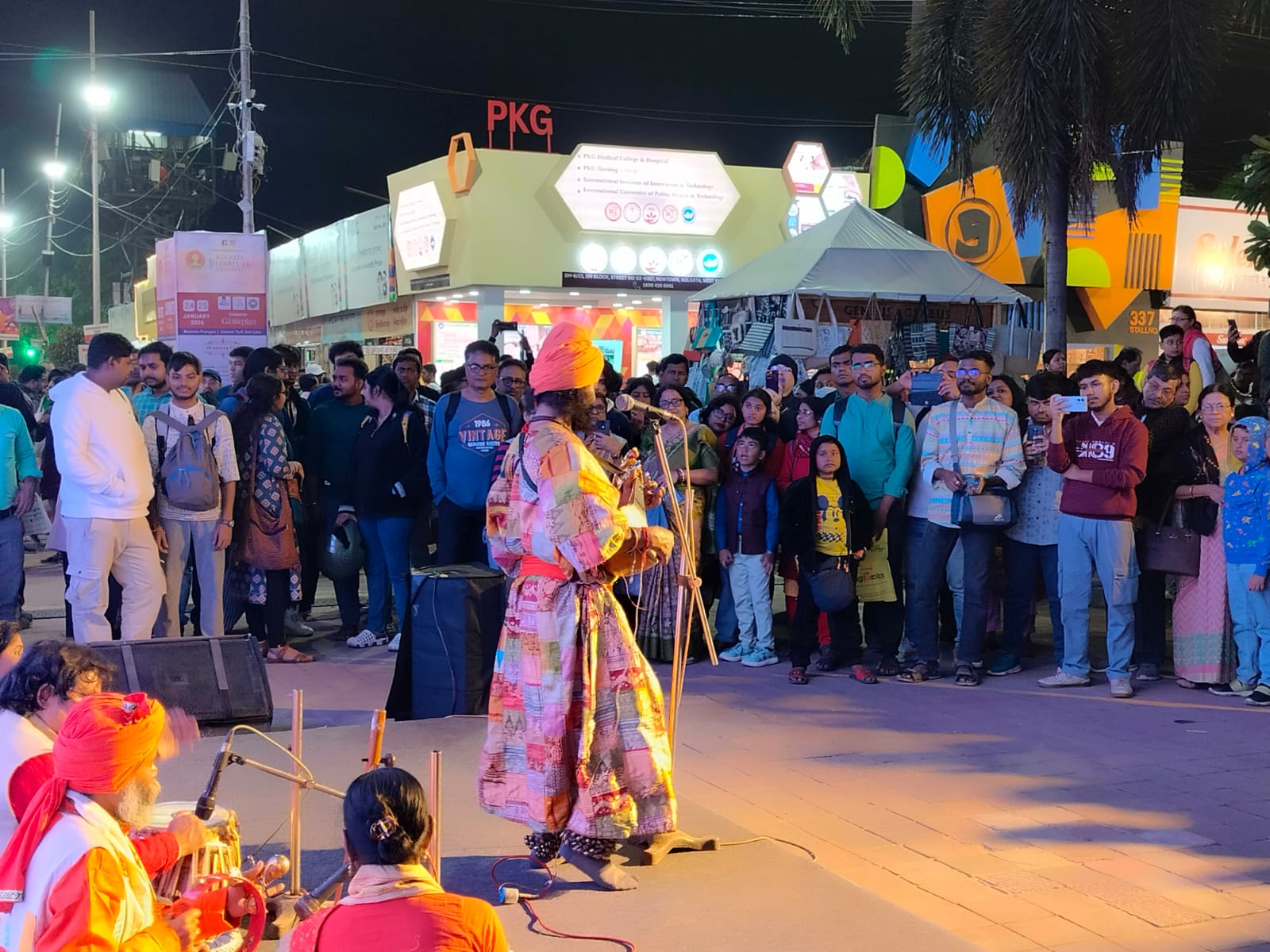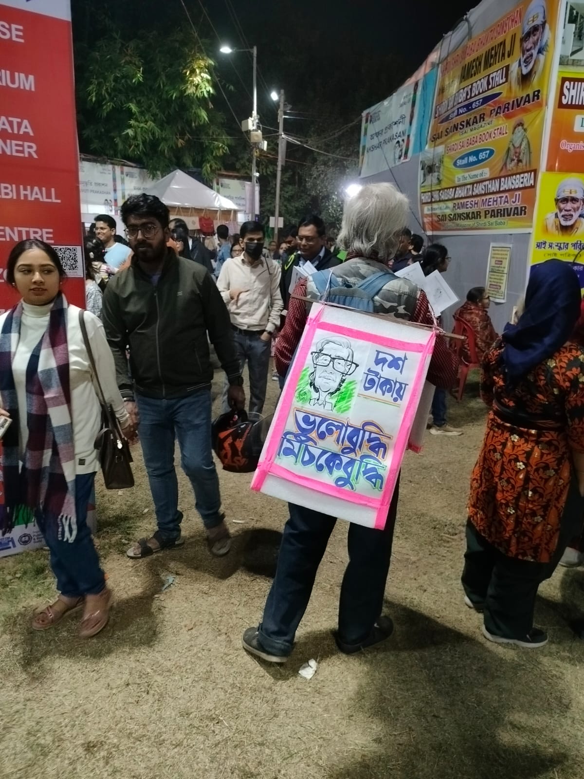 দে’জ পাবলিশিং-এর স্টলে নামলিপি নিয়ে ইতিমধ্যেই কড়চায় লেখা হয়েছে, তাই ও পথে না হেঁটে পাশের এক গলিতে ঢুকতেই ভারতী বুক স্টল-এর দেওয়াল লিখন আর ‘ছাত্রসংগ্রাম’-এর স্লোগানে চোখ আটকাল– ‘বসন্ত কান পেতে ক্লাসরুমে গান শোনে/ শেকড়ে নোঙর গেঁথে বদলের দিন গোনে’। বাস্তবিকই একাধিক গান কানে ভেসে এল গিল্ড অফিসের এধার ওধার থেকে। পশ্চিমবঙ্গ মণ্ডপের বাউল গান মিশে গেল এসবিআই অডিটোরিয়ামে চলা অনুপম রায়ের লাইভ পারফরম্যান্সের সঙ্গে। কোলকাতা লিটারেচার ফেস্টিভ্যালের শেষদিন উপলক্ষে এই আনন্দ আয়োজন।