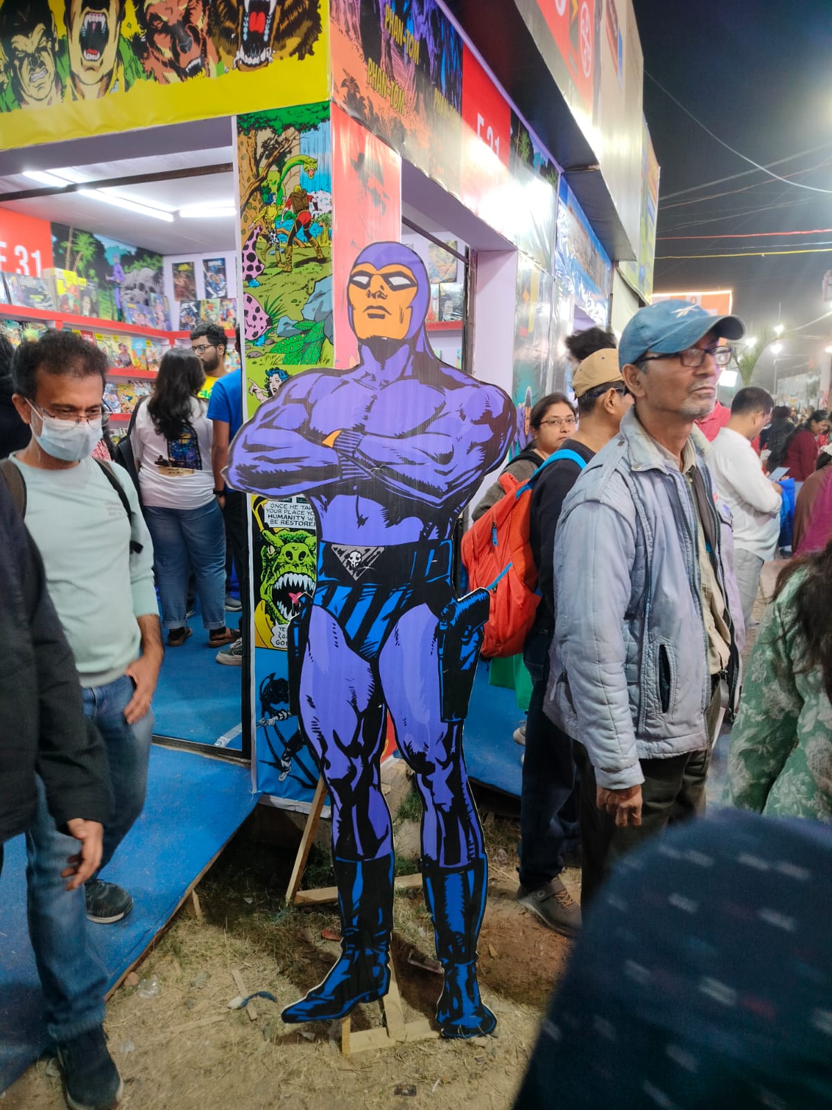 যে কথা না বললেই নয়, এ বছর মেলার মাঠে কমিক্স সত্যিই ধুন্ধুমার বাধিয়ে দিয়েছে। ‘শক্তি কমিক্স’-এর সামনেই স্বয়ং অরণ্যদেব দাঁড়িয়ে স্বাগত জানাচ্ছেন পাঠকদের। ‘অমর চিত্রকথা’ তাদের সুবিশাল স্টলের সবটাই সাজিয়েছে কমিক্স চরিত্রদের নিয়ে। অসংখ্য বাংলা কমিক্সের বই প্রকাশিতও হয়েছে মেলায়, যার মধ্যে কাফি খাঁ, সন্দীপ রায়, ময়ূখ চৌধুরী, অরিজিৎ দত্ত চৌধুরীর কাজ বিশেষভাবে উল্লেখযোগ্য। ইংরেজি বইয়ের স্টলগুলি গতবছর থেকে ঢাকা দেওয়া হলের বাইরে চলে আসায়, বাহার বেড়েছে তাদের অঙ্গসজ্জায়। পেঙ্গুইন ৮০ বছর উদযাপন করেছে অগুনতি মলাটের কোলাজে স্টল সাজিয়ে। অন্যদিকে, প্যান ম্যাকমিলান ‘প্যালেস অফ ইলিউশনস’ বইয়ের প্রচ্ছদের সুবিশাল ব্লো-আপ পোস্টারের সামনে ছবি তোলার কন্টেস্ট আয়োজন করে বেশ হইচই ফেলে দিয়েছে।