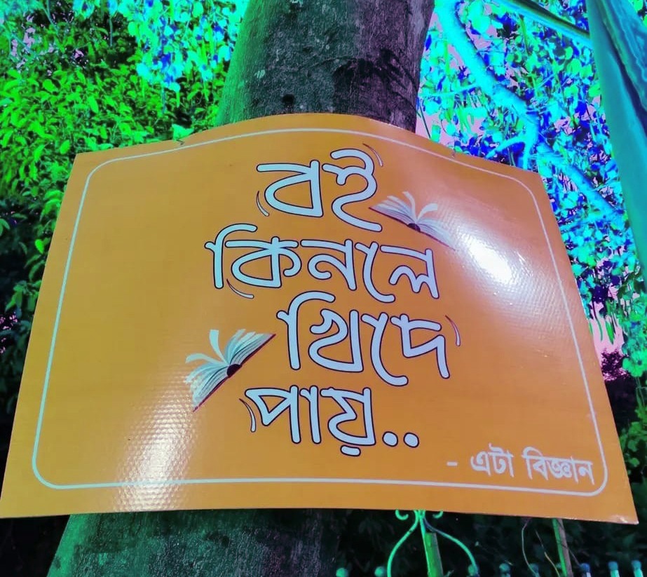 কোনও এক ওষুধের দোকান এককালে এক অভিনব নোটিশ ঝুলিয়েছিল– ’এইখানে সব হেভি হেভি ডাক্তারবাবুরা বসেন।’ মতান্তর থাকতেই পারে, তবে ২০২৬-এর বইমেলা বাণীপ্রধান। আদ্যিকালের সাইনবোর্ডের ধাঁচে হাতে লেখা (অথবা ছাপানো) অভিনব সব সংলাপ মেলার চারিদিকে! ‘বই কিনলেই নাকি খিদে পায়’– তেমনই এক ব্যানারের দাবি।