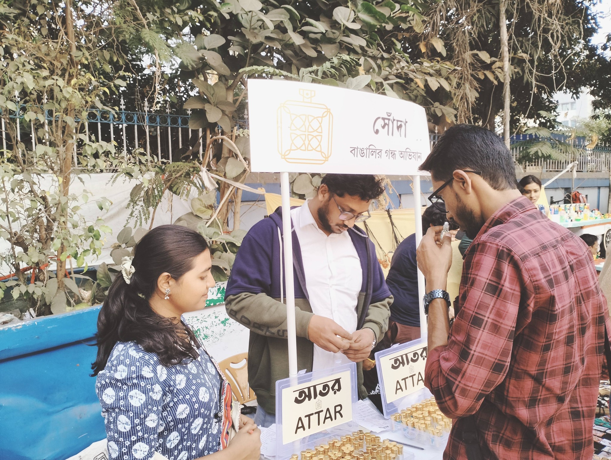 ভালোবাসি, কারণ বইমেলার নিজস্ব শব্দ রয়েছে। রয়েছে নিজস্ব গন্ধও। সদ্য ছাপা বইয়ের গন্ধ। ঘামের গন্ধ। ধোঁয়া ওঠা চায়ের গন্ধ। লিটল ম্যাগ পেরলেই চিরাচরিত ফিশফ্রাইয়ের গন্ধ। এ বছর মেলায় রয়েছেন ‘সোঁদা’-র গন্ধব্যাপারীরাও, তাঁদের বানানো চমৎকার সব আতরের পসরা নিয়ে।
