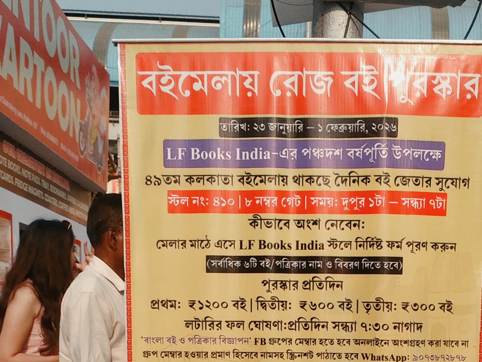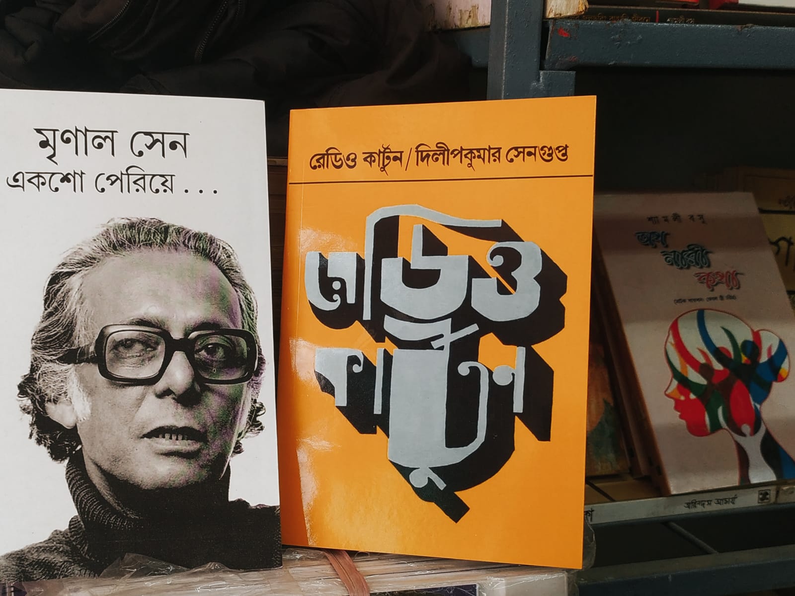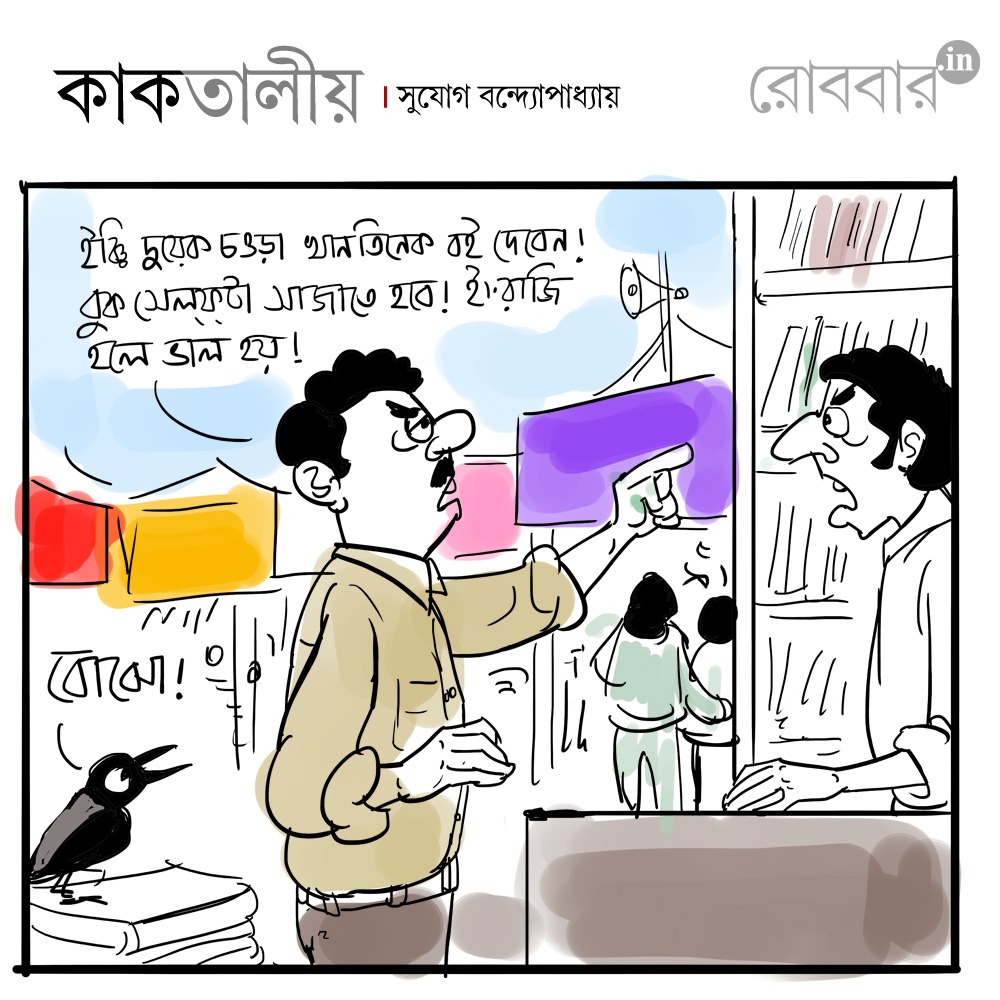 দিলীপকুমার সেনগুপ্ত-র বহুদিন অলভ্য ‘রেডিও কার্টুন’ বইটির ফ্যাক্সিমিলি কেউ একজন নিজের গরজে ছেপে কিছু কিছু অনামা স্টলে রেখে গিয়েছেন। বইটিতে দাম অবধি লেখা নেই। আজকালের মিনিবুক এসে পৌঁছেছে গতকাল; কিন্তু গাঙচিলে খোঁজ নিয়ে জানা গেল, রঘুনাথ গোস্বামীর মিনিবুক এখনও এসে পৌঁছয়নি। তবুও প্রয়াস থেকে প্রকাশিতব্য অমিতাভ মৈত্রের ‘রিলকেচর্চা’ বইটির ফাইনাল প্রুফ ক’দিন আগেই হাসপাতালের বেডে শুয়ে সংশোধন করে পাঠিয়েছেন সম্পাদক। সে বইটিও এখনও মেলার মুখ দেখেনি। প্রকাশক জানালেন, আজকালের মধ্যেই এসে পড়বে। রবি-সোম দু’ দিনের ভিড়টুকু পেতে কেউ কেউ একরকম জোর করেই নিয়ে এসেছেন সদ্য বাঁধানো, কাঁচা বই। তেমন একজনকে দেখা গেল, দুপুরের রোদে বই শুকোতে দিচ্ছেন।