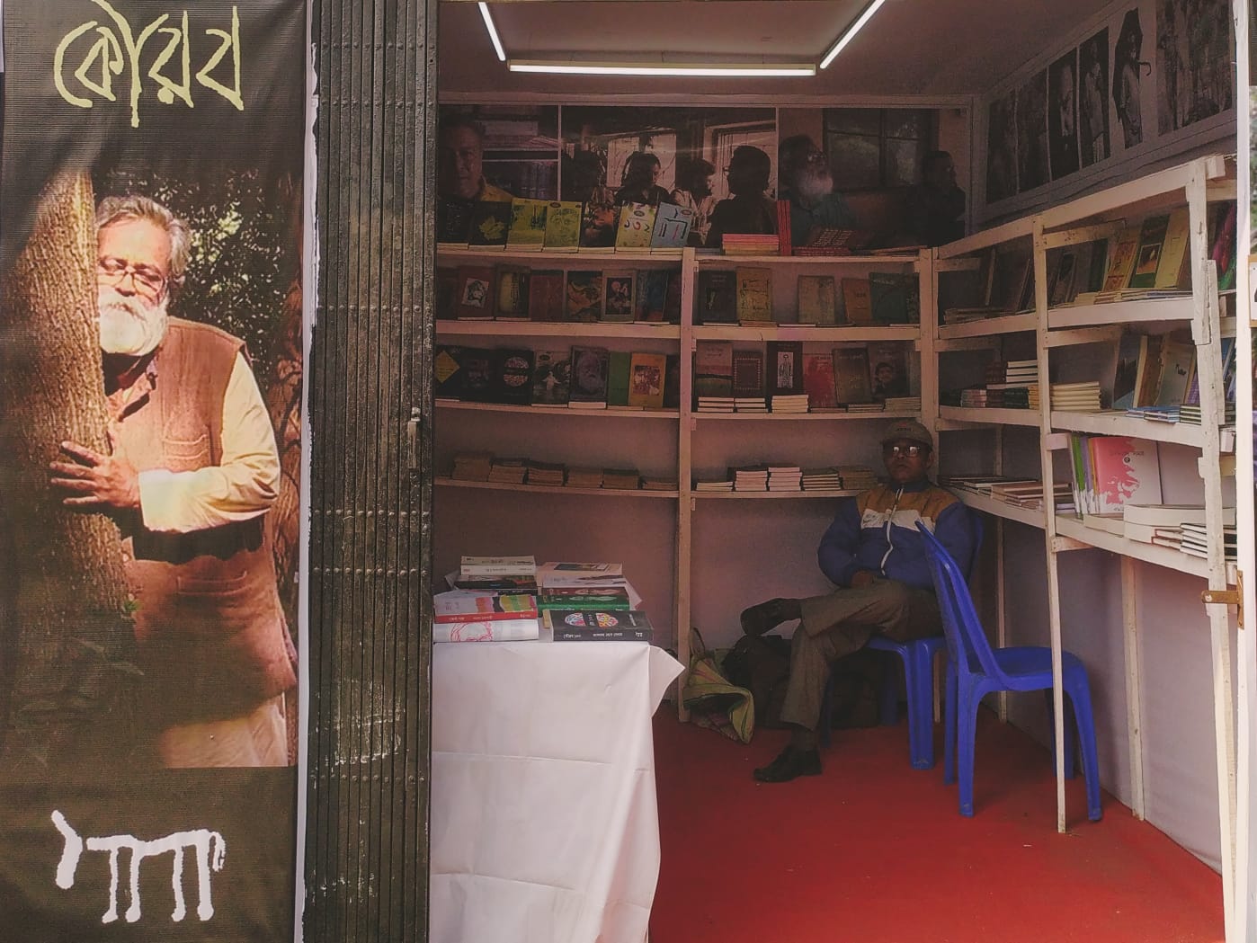 গতবার অবধি যে রাহুল পুরকায়স্থকে লিটল ম্যাগের আশেপাশে ঘুরে বেড়াতে দেখা গেছে, এ বছর তাঁর নামেই প্যাভিলিয়ন। বাঁ দিকের লেন দুর্দমনীয় জ্যোতির্ময় দত্ত-র নামে। ডানদিক ধরে একটু এগলে পরিচিত গাধার লোগো। কৌরবের গেটের একপাশে যেখানটাতে দাঁড়িয়ে কমল চক্রবর্তী একসময় ‘হে বৃক্ষনাথ’ বলে চেঁচিয়ে উঠতেন, সেখানে এখন তাঁর ছবি– আশরীর জড়িয়ে রয়েছেন একখানা গাছকে। বইমেলা, ভুলতে দেয় না।
