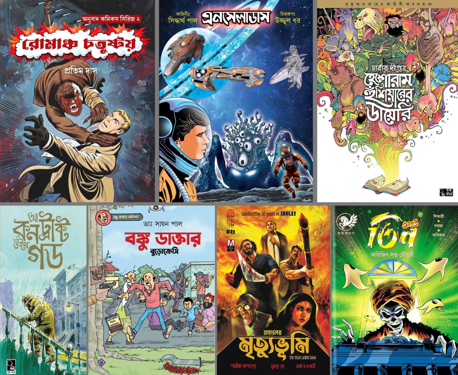 আটের দশকের কৈশোর-স্মৃতি উসকে দিয়ে এ ফেরা রীতিমতো চিত্তাকর্ষক। অন্তরীপ কমিক্স নিয়ে এসেছে ‘মৃত্যুভূমি’ (মহাপ্রলয়), অন্যদিকে “লুবলু’র পৃথিবী” খ্যাত চার্বাক দীপ্ত-র হাত ধরে প্রকাশ পেয়েছে সুকুমার রায়ের ‘হেশোরাম হুঁশিয়ারের ডায়েরি’ ও উইল আইসনারের ‘আ কন্ট্রাক্ট উইথ গড’। প্রকাশক বুক ফার্ম। এবারত প্রকাশনী ছেপেছেন ‘এনসেলাডাস’ ও ‘রোমাঞ্চ চতুষ্টয়’। ‘মায়াকানন’ বাজারে এনেছেন অরিজিৎ দত্ত চৌধুরীর ভৌতিক কমিক্সের নতুন সংকলন ‘আরও তিন’। আন্তর্জাতিক মানের কাছাকাছি বাংলা কমিক্সের কাজও যে পৌঁছে যেতে পারে, তা প্রমাণ করেছেন শিল্পী সুমন্ত গুহ। তাঁর আঁকা ‘অন্ধকারের বন্ধু’ ২০২৫-এর পূজাবার্ষিকী আনন্দমেলাতেই পাঠকদের মন জয় করে নিয়েছিল, মেলার মাঠে তাই-ই হাজির বই হয়ে। প্রকাশক আনন্দ পাবলিশার্স।